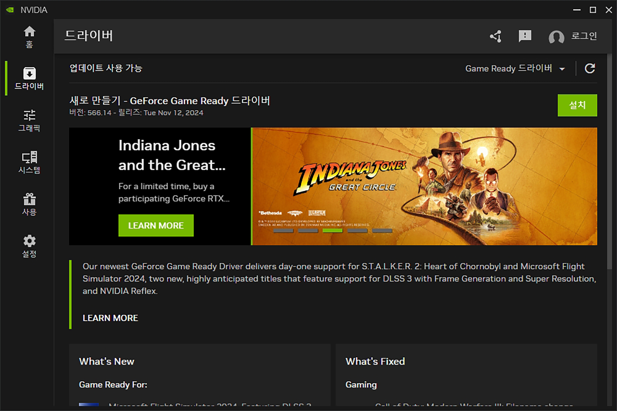 제가 NVIDIA 앱을 사용하는 이유 중에 하나는 그래픽카드의 드라이버를 항상 최신으로 유지할 수 있다는 점입니다. 만약 최신 버전이 있으면 알림이 표시되고 다운로드와 설치 버튼을 통해서 간단하게 인스톨할 수 있습니다. 그리고 설치가 완료되면 그래픽카드 드라이버와 PhysX 시스템 소프트웨어 그리고 HD 오디오 드라이버의 버전을 확인할 수 있습니다.