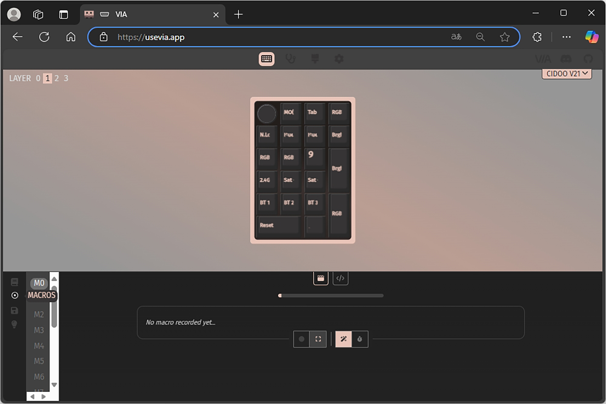 VIA에서는 매크로 기능을 설정할 수 있는데요. 자신의 작업 일부를 자동화할 수 있습니다. 그리고 현재 레이아웃 설정을 저장하거나 불러올 수 있고 CIDOO V21 넘버패드의 백라이트 기능을 조절할 수 있는 기능도 탑재되었습니다. VIA의 기능은 생각보다 다채롭다는 것을 확인할 수 있습니다.