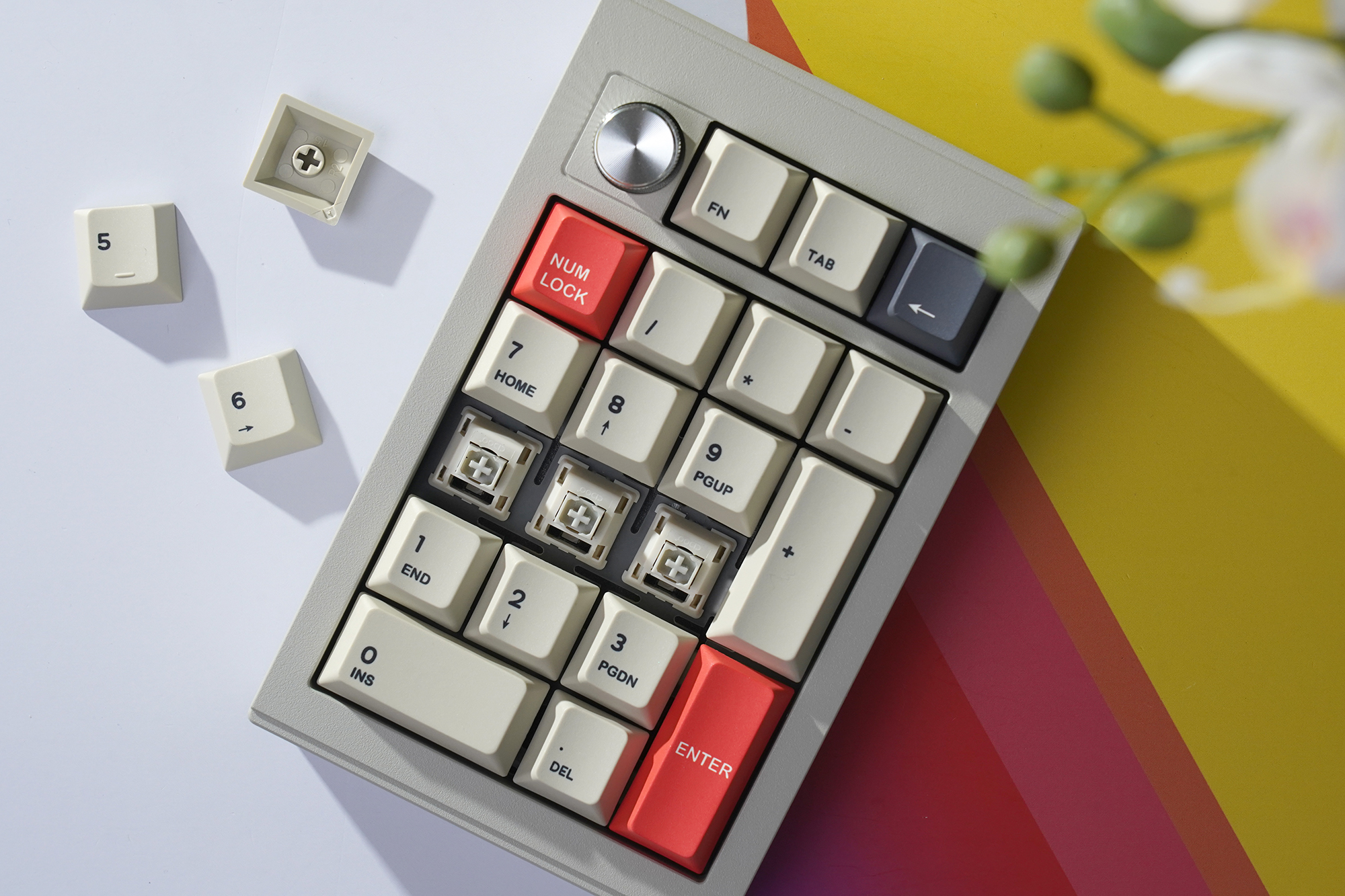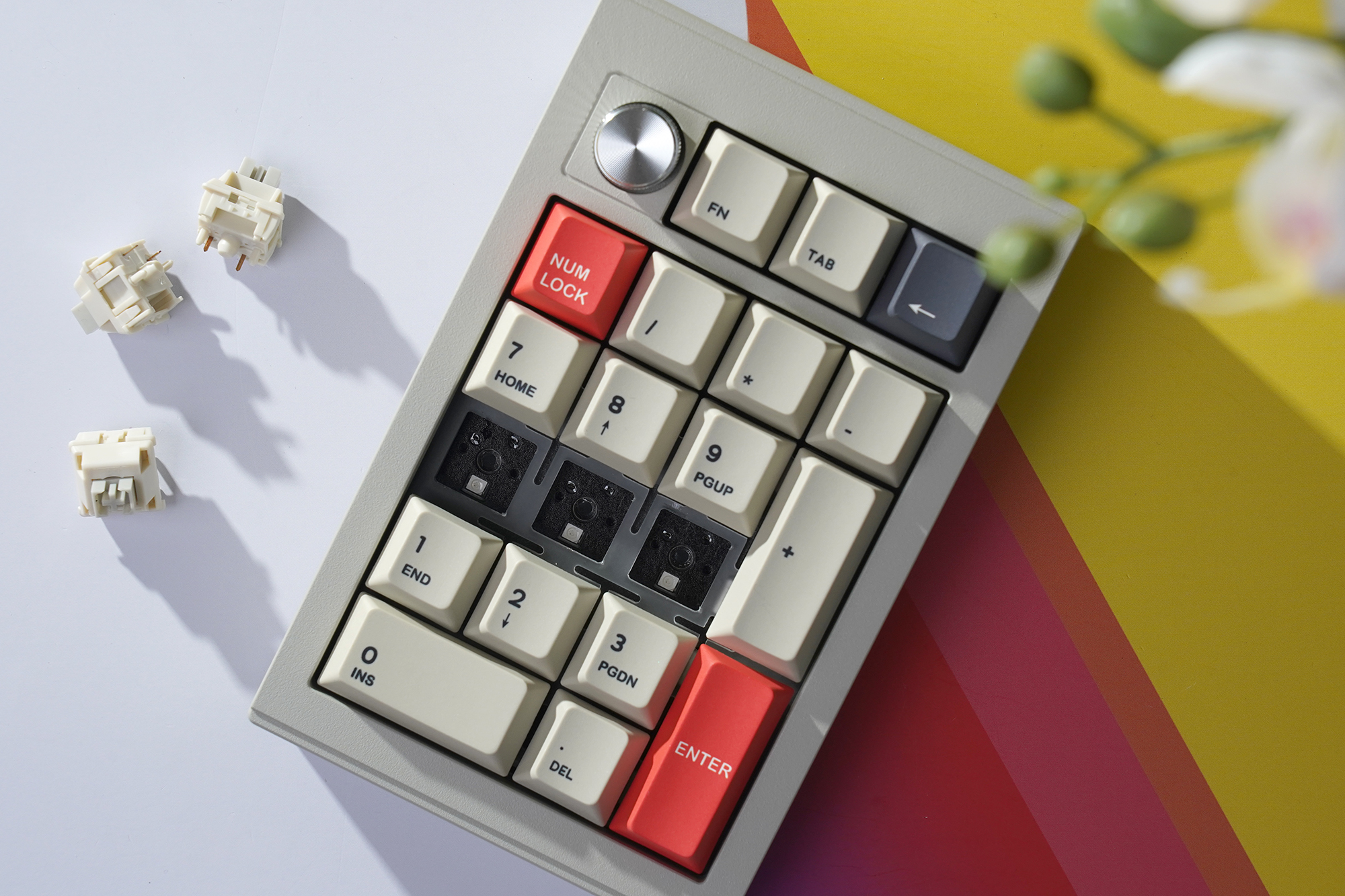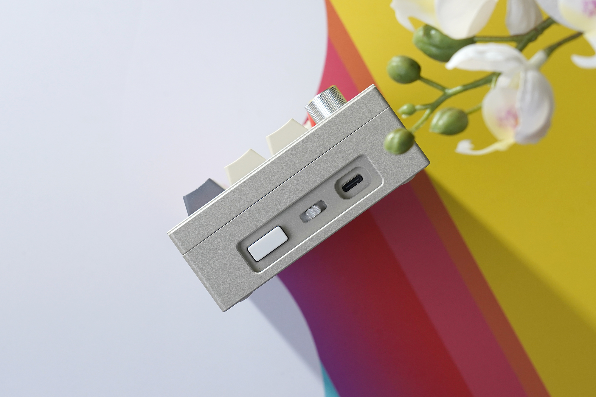 CIDOO V21 넘버패드의 케이스는 알루미늄으로 제작되었는데요. 색상은 아이보리와 회색의 중간 정도입니다. 전체적으로 깔끔한 느낌을 주는 편이고 작년 정도에 유행했던 노브(KNOB)가 부착된 것을 확인할 수 있습니다. 최근에는 노브보다는 LCD를 탑재하는 추세입니다.