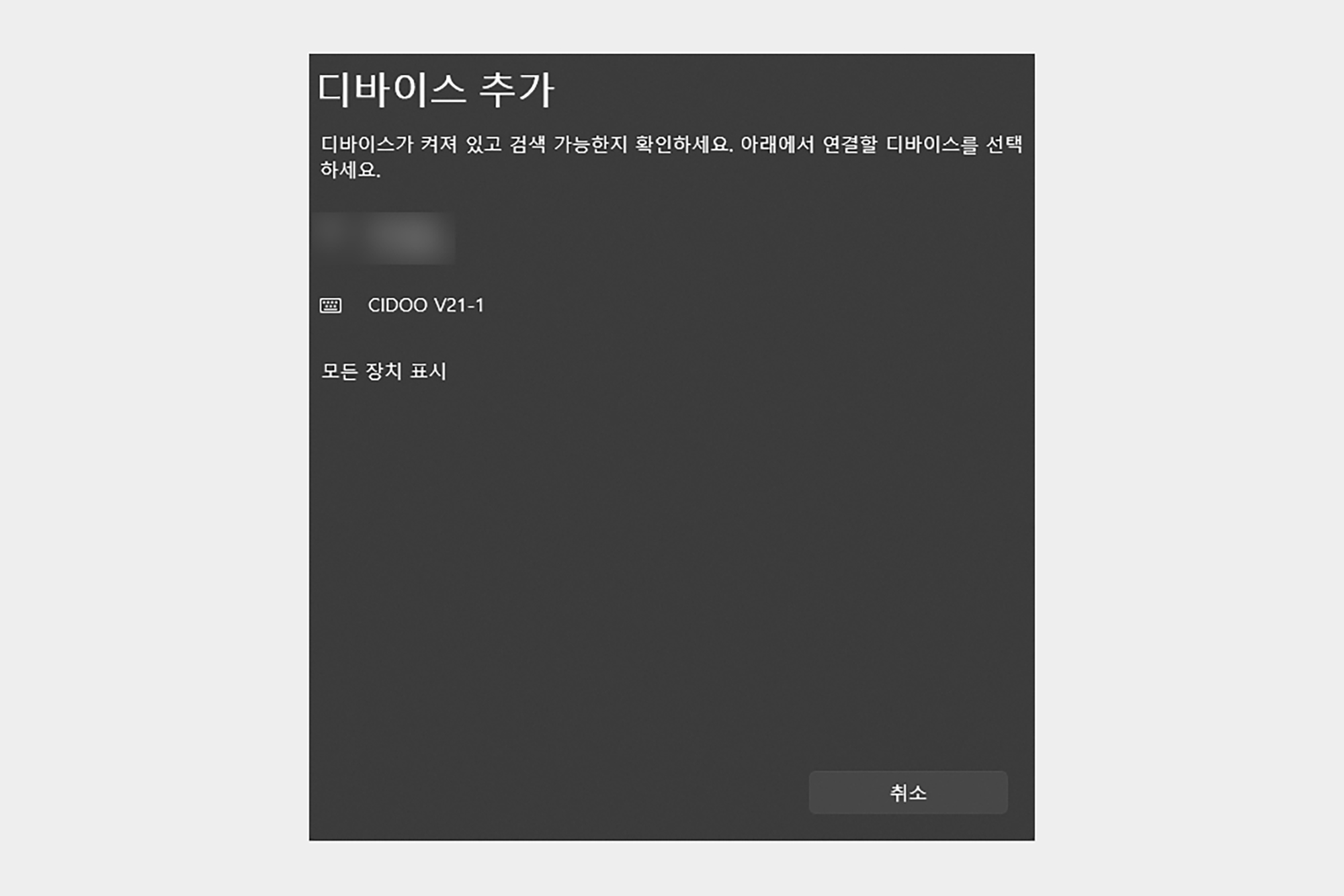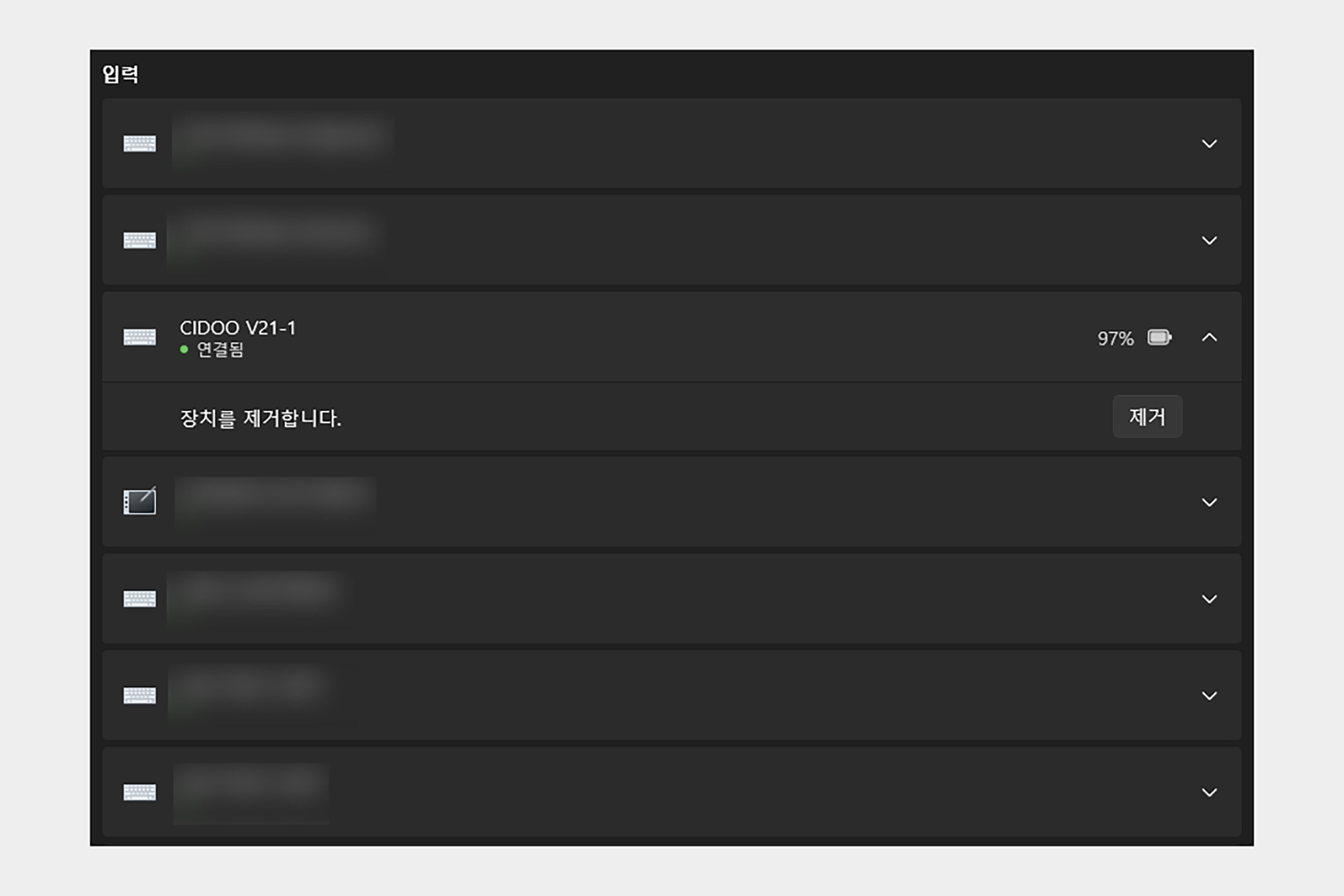 그리고 FN+1, 2, 3버튼을 길게 누르면 블루투스 페어링 모드로 들어가고 CIDOO V21-1이라는 이름을 검색해서 등록해 주면 됩니다. 그리고 블루투스가 연결된 상태에서는 현재 배터리 상태를 확인할 수 있습니다.