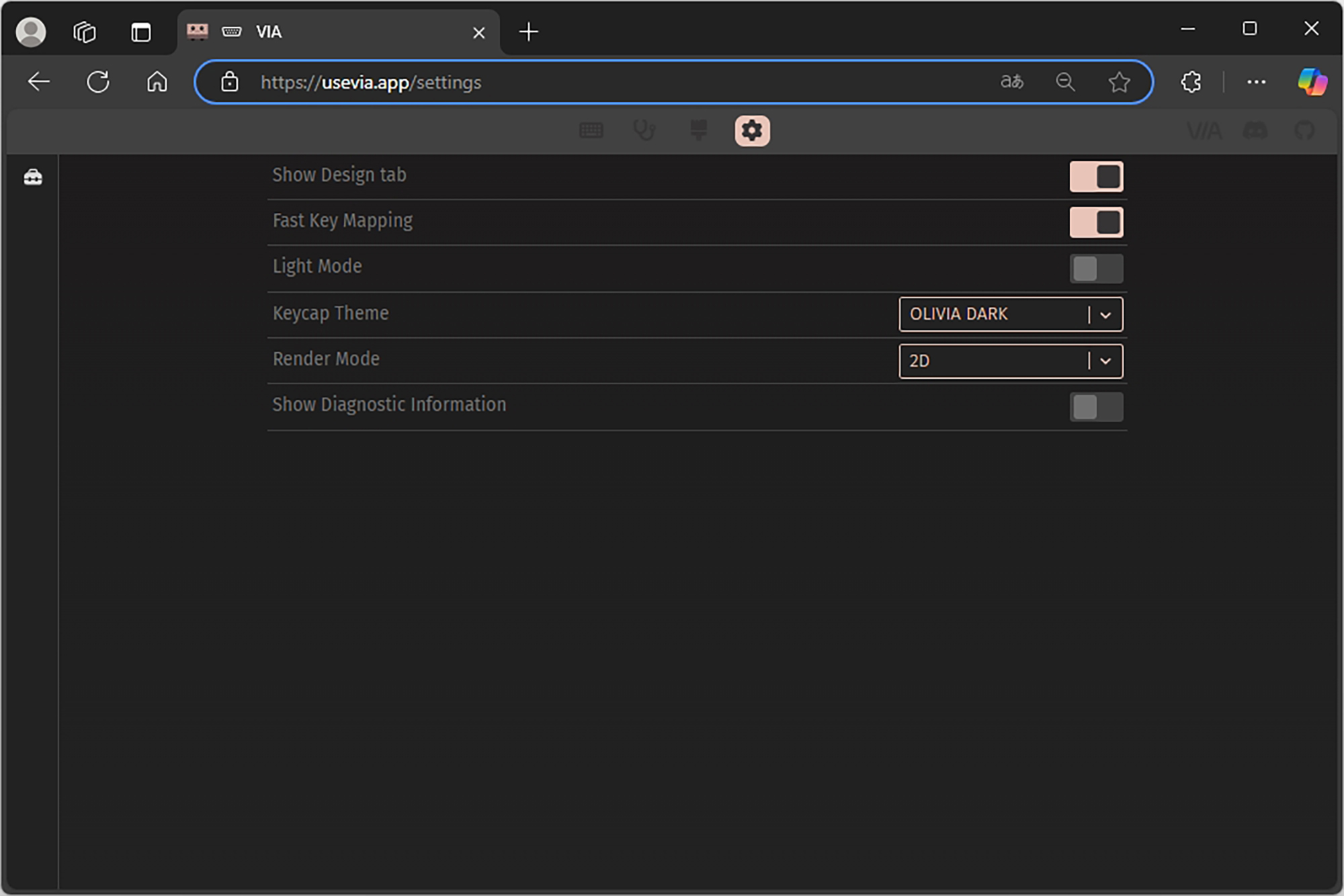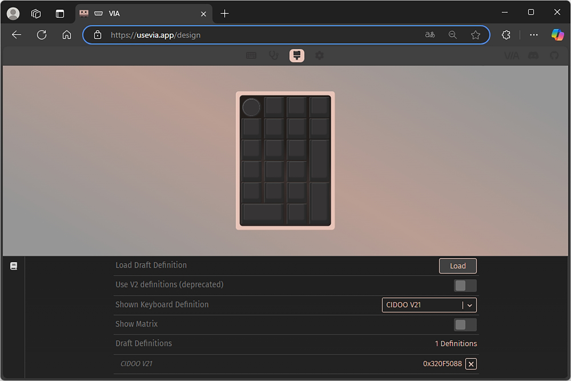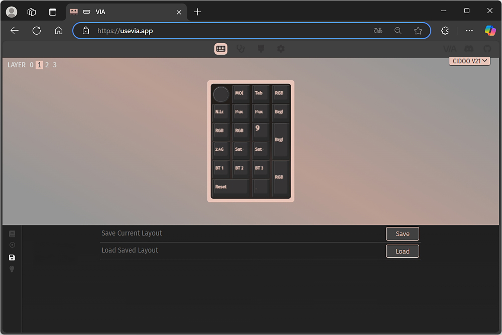 이럴 때는 설정의 Show Design tab을 활성화하고 Load를 눌러서 연결 방식에 따라서 CIDOO V21-2.4G.JSON 혹은 CIDOO V21-USB.JSON 파일을 로드하면 레이아웃이 제대로 인식됩니다. JSON(JavaScript Object Notation) 파일은 키보드의 설정과 키맵, 레이아웃, 매크로 등 다양한 정보를 저장하는 역할을 합니다.