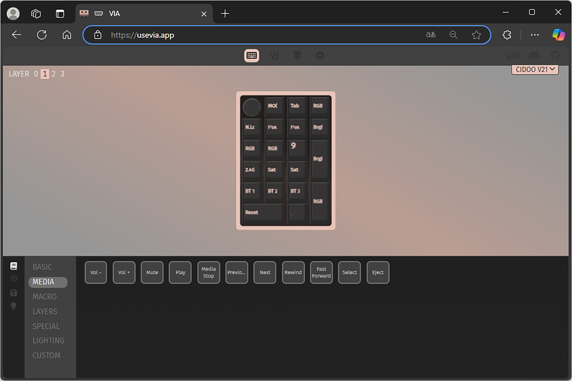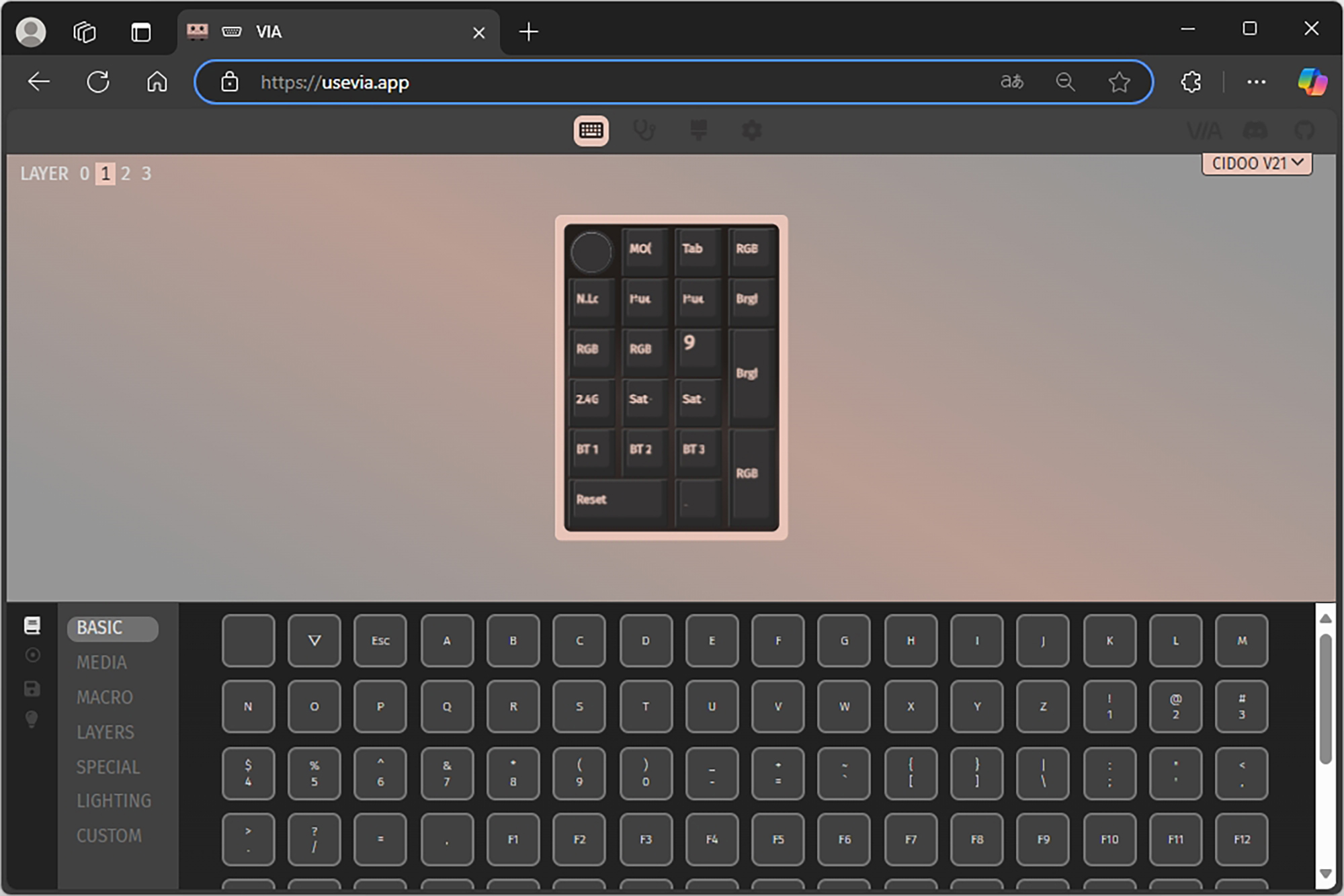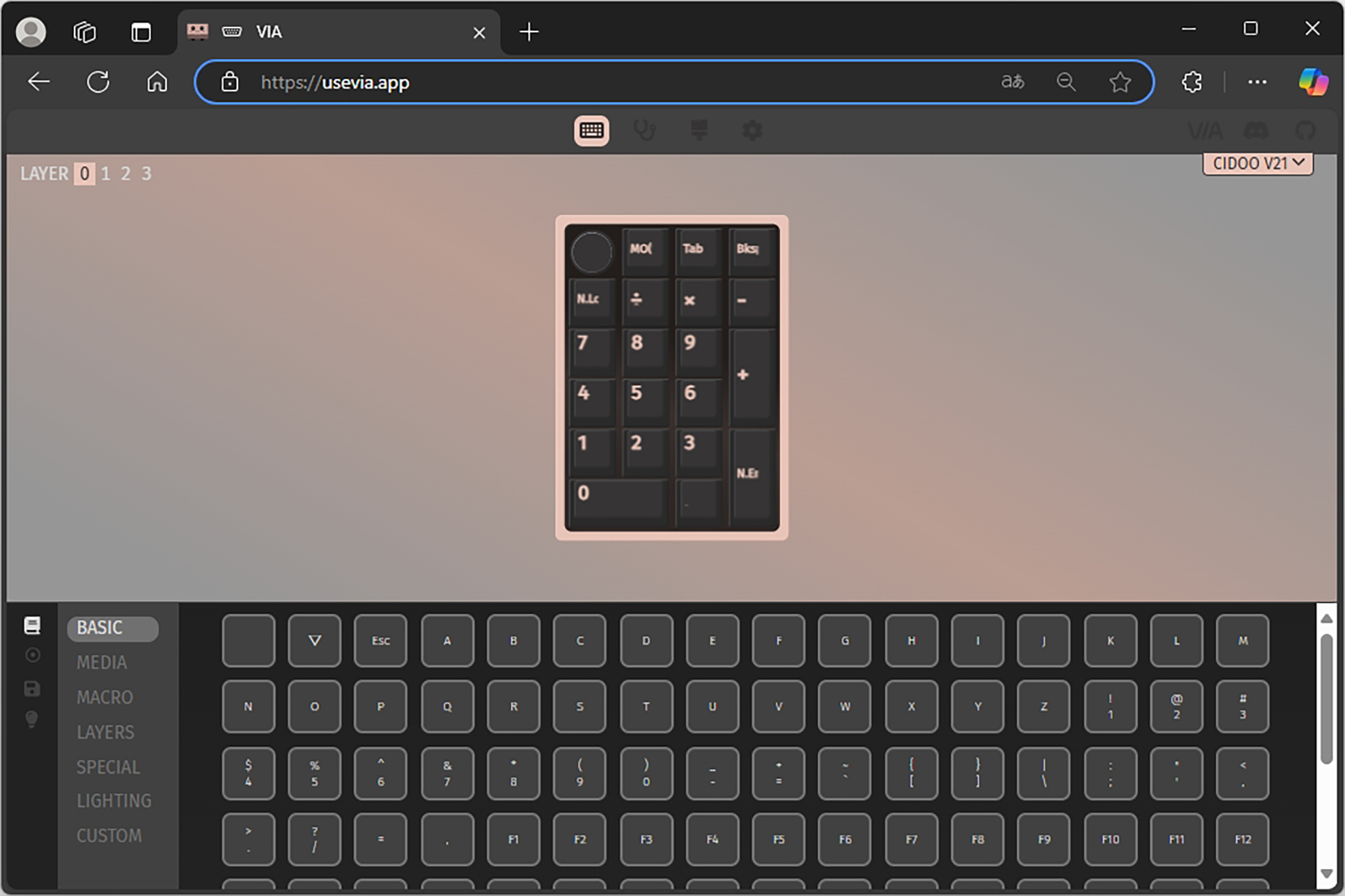 VIA에서는 BASIC, MEDIA, MACRO, LAYERS, SPECIAL, LIGHTING, CUSTOM 등 다양한 기능들을 자신이 원하는 키에 할당해서 사용할 수 있는데요. 한 번 CIDOO V21 넘버패드에 인식되면 프로그램의 윈도우 상주 여부와 상관없이 해당 기능이 동작합니다. 이러한 설정은 다른 컴퓨터에 연결했을 때도 동일하게 적용됩니다.