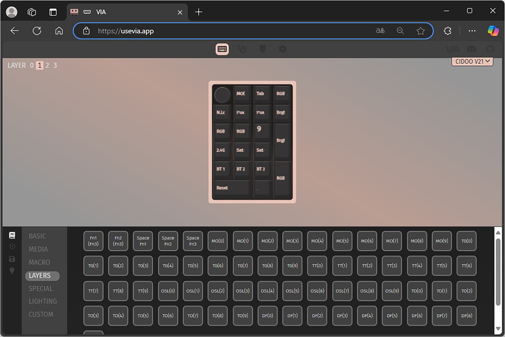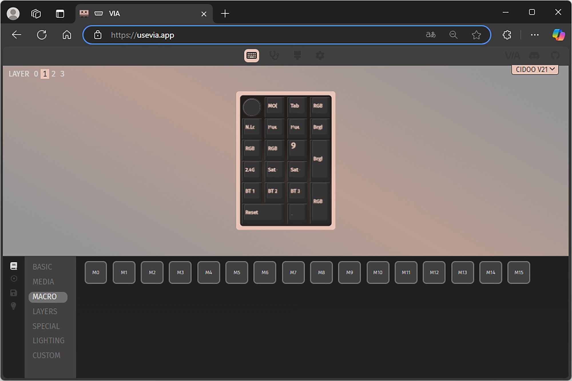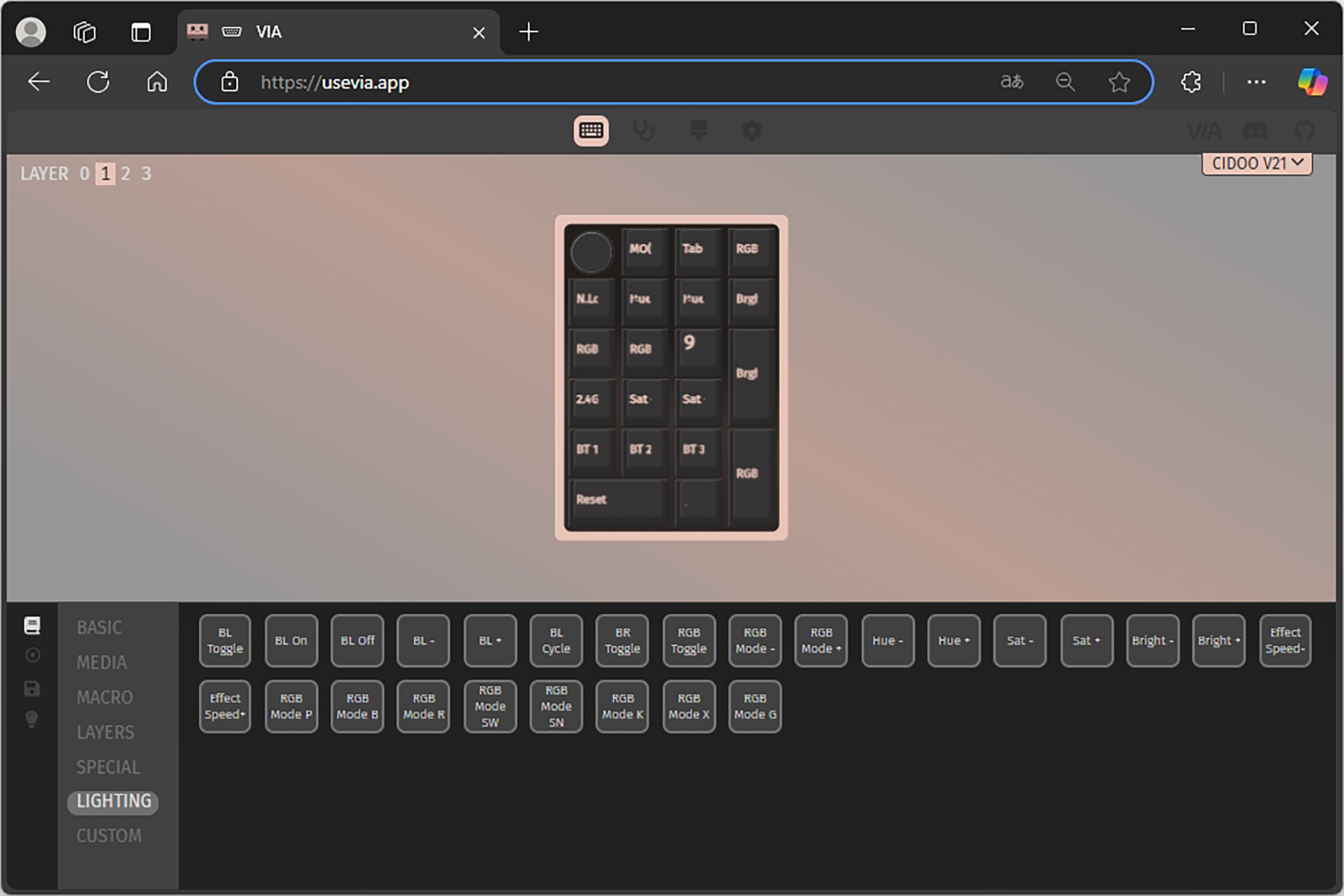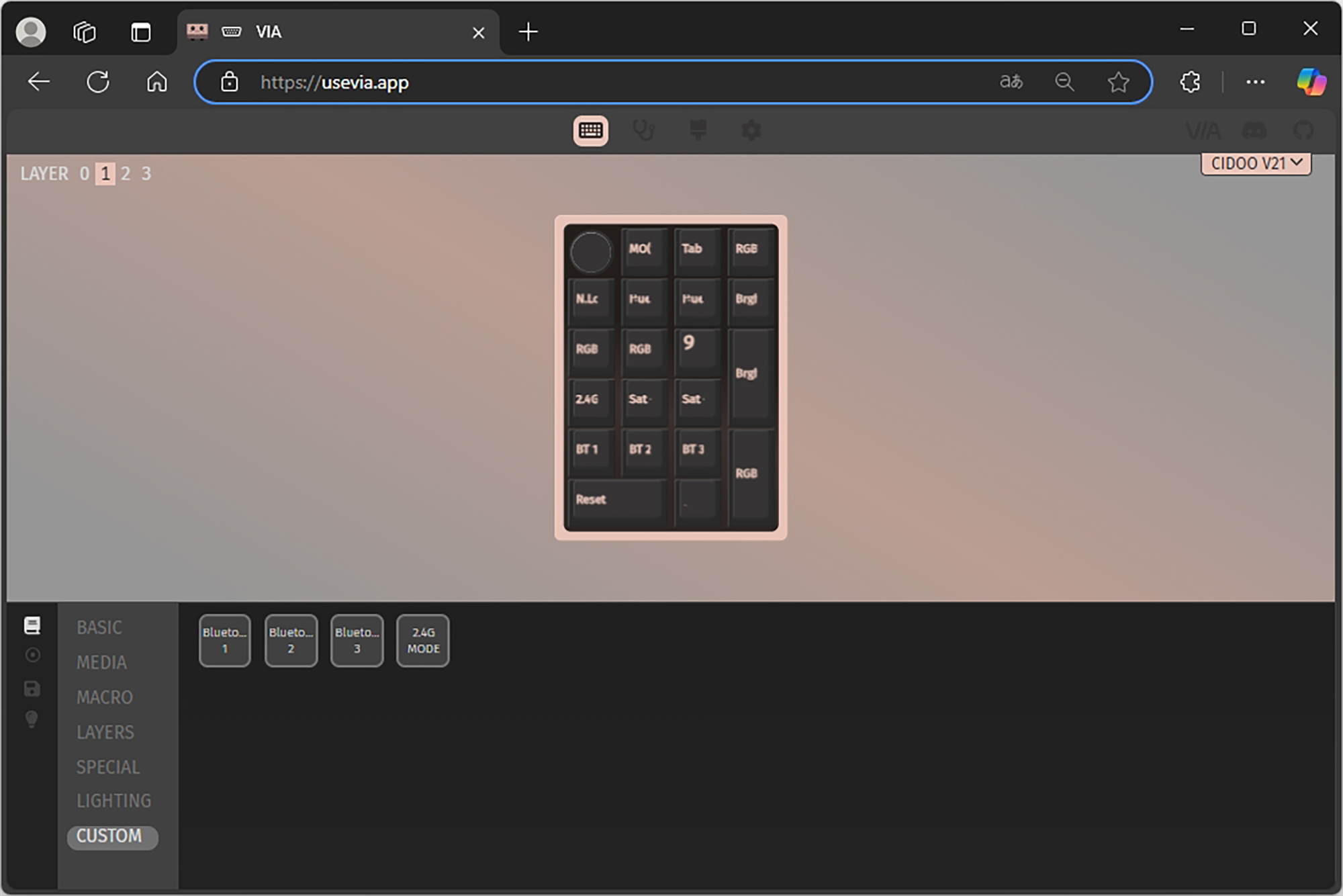 VIA에서는 BASIC, MEDIA, MACRO, LAYERS, SPECIAL, LIGHTING, CUSTOM 등 다양한 기능들을 자신이 원하는 키에 할당해서 사용할 수 있는데요. 한 번 CIDOO V21 넘버패드에 인식되면 프로그램의 윈도우 상주 여부와 상관없이 해당 기능이 동작합니다. 이러한 설정은 다른 컴퓨터에 연결했을 때도 동일하게 적용됩니다.