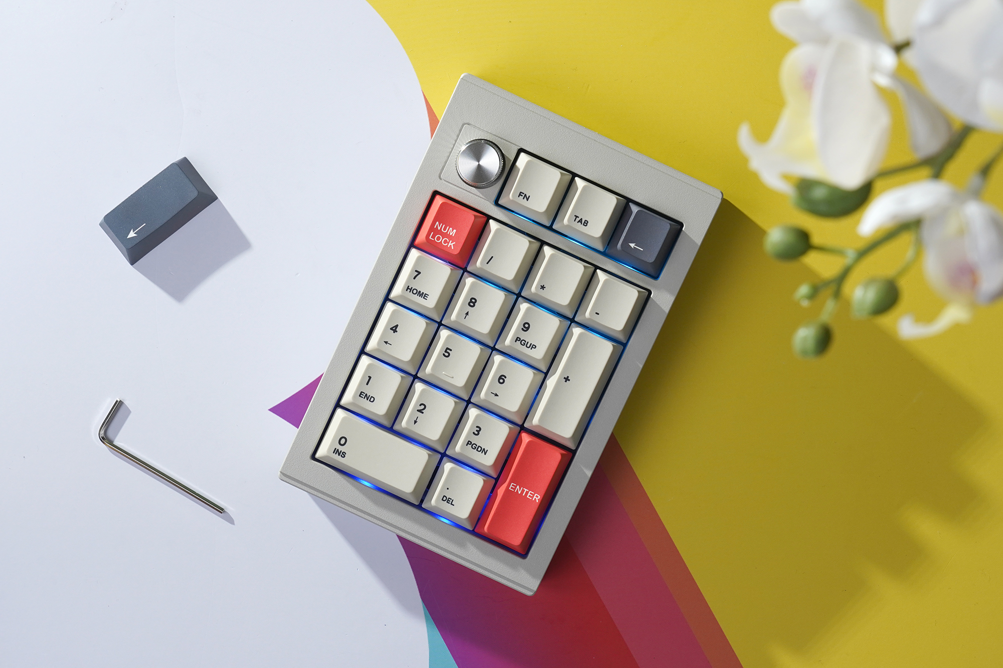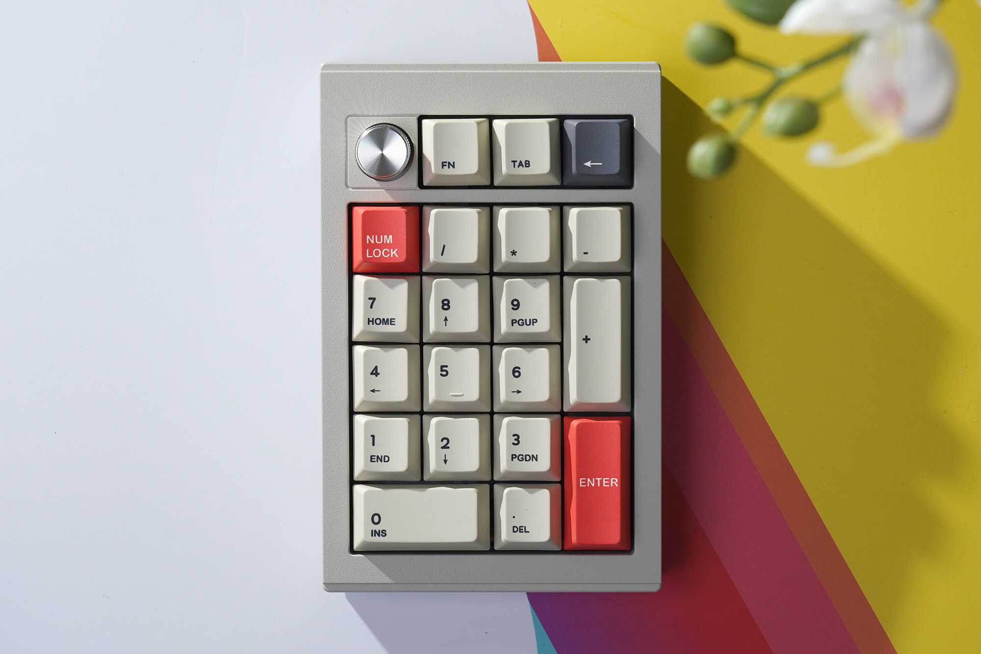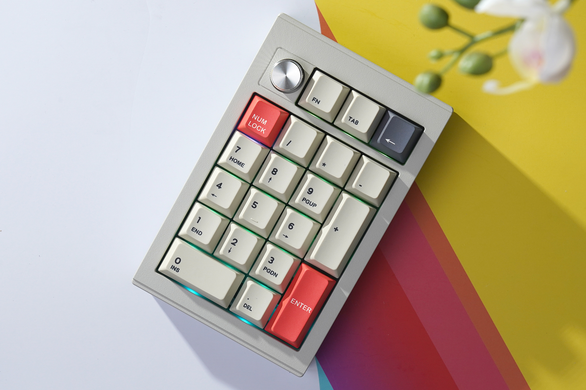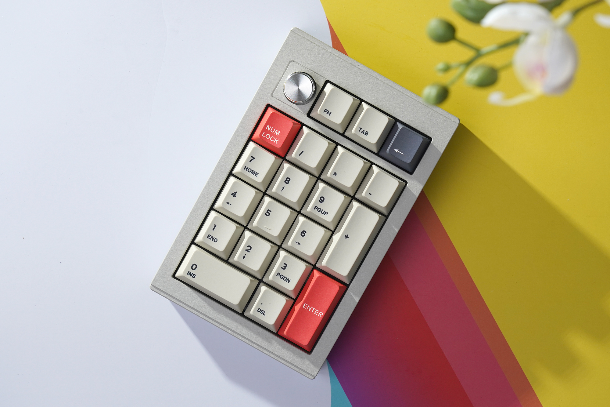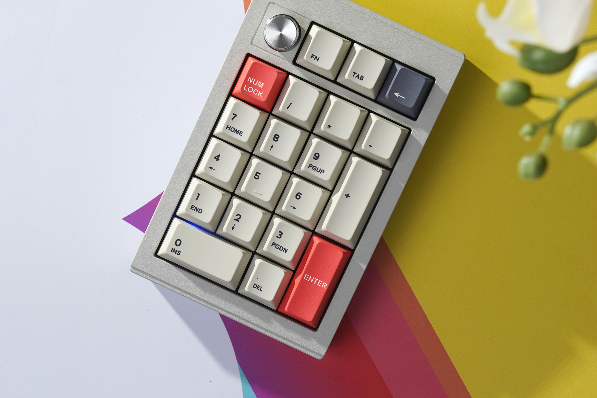 CIDOO V21 넘버패드는 108키 키보드의 오른쪽에 있는 숫자키를 대체하는 용도로 사용하는 제품이라서 레이아웃 자체는 크게 다르지 않습니다. 그렇지만 상단에 볼륨 등을 조절할 때 사용하는 노브가 배치되어 있고 FN, TAB, BACK SPACE가 준비되어 있다는 점이 차별화된 특징입니다.