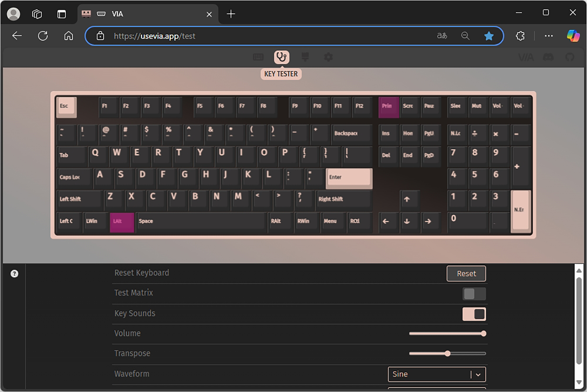 VIA는 커스텀 키보드를 조립하는 취미를 가진 분들에게 필수적인 프로그램이라고 할 수 있는데요. 가장 많이 사용하게 되는 기능은 바로 키 테스터로 스위치나 PCB 기판의 불량 여부를 확인할 수 있습니다.