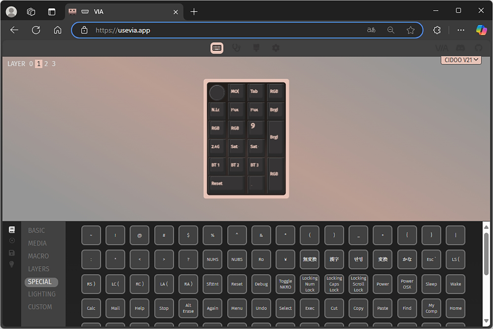 VIA에서는 BASIC, MEDIA, MACRO, LAYERS, SPECIAL, LIGHTING, CUSTOM 등 다양한 기능들을 자신이 원하는 키에 할당해서 사용할 수 있는데요. 한 번 CIDOO V21 넘버패드에 인식되면 프로그램의 윈도우 상주 여부와 상관없이 해당 기능이 동작합니다. 이러한 설정은 다른 컴퓨터에 연결했을 때도 동일하게 적용됩니다.