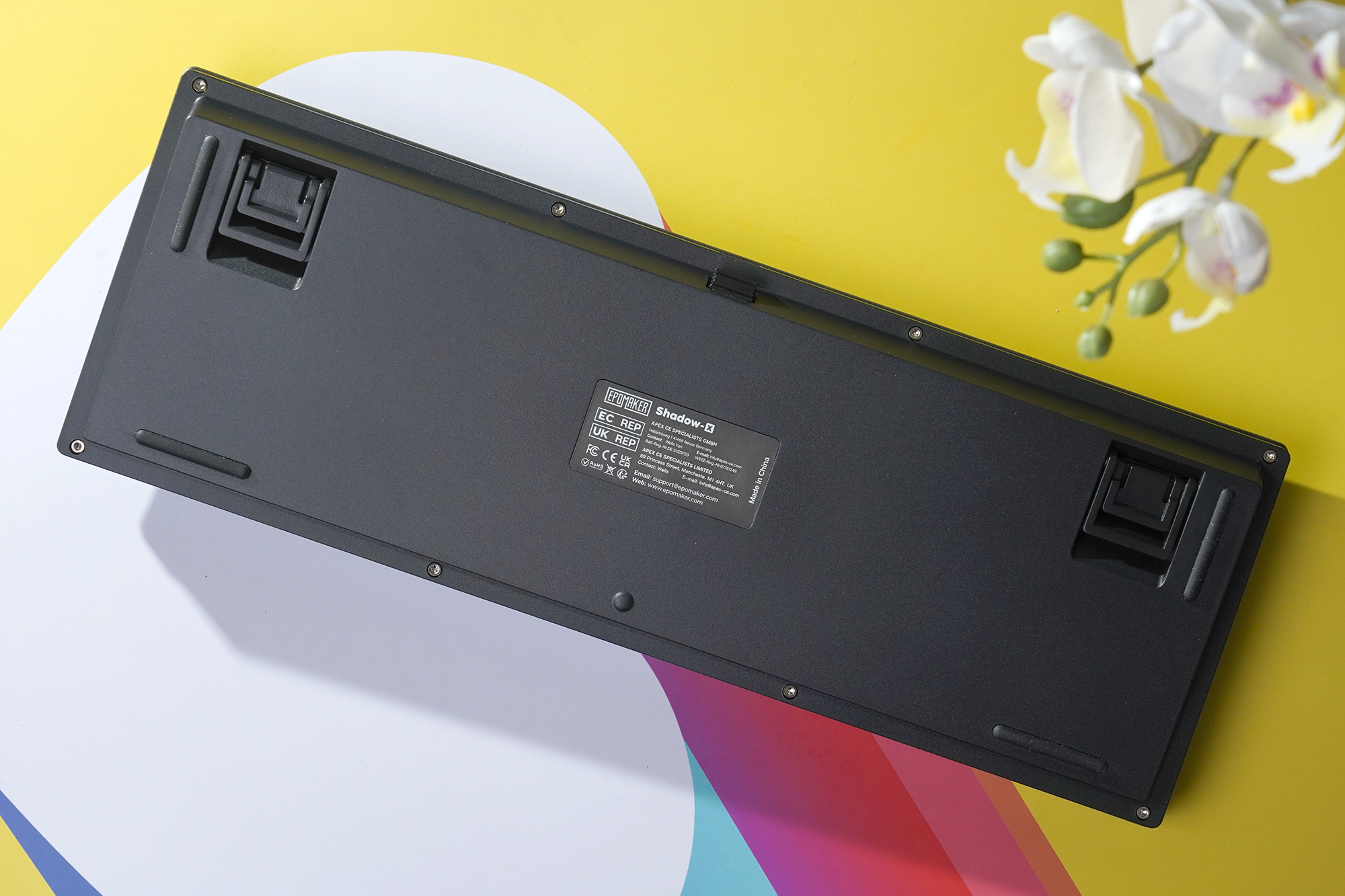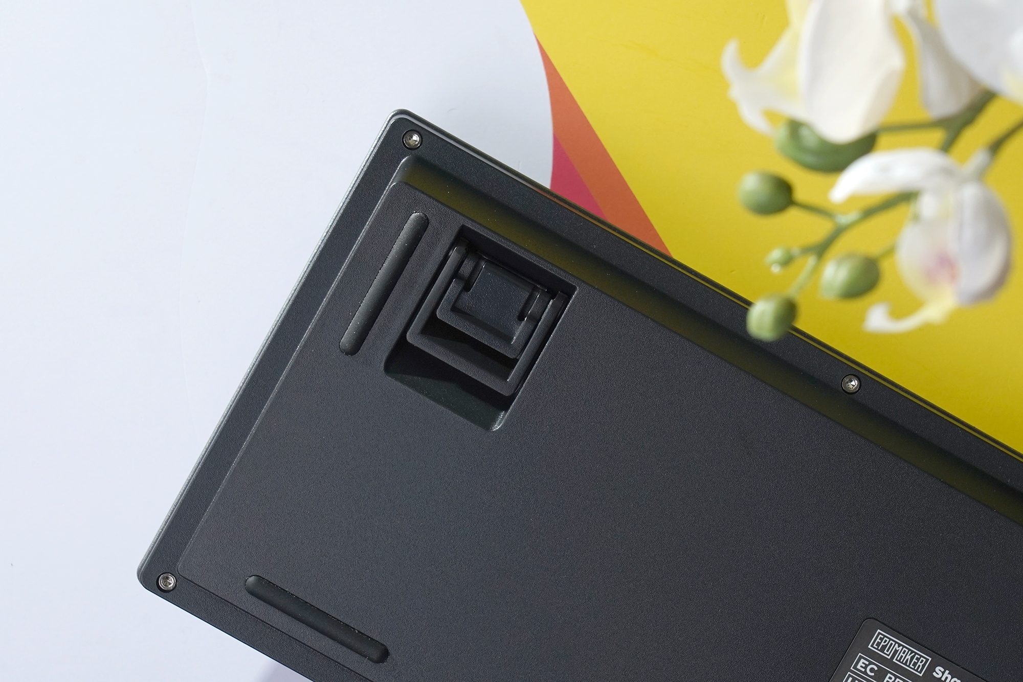 Epomaker Shadow-X 무선 키보드의 바닥을 살펴보면 모서리 부분에 고무 지지대가 배치되어 있어서 책상 위에서 잘 미끄러지지 않습니다. 그리고 2단계로 각도를 조절할 수 있는 다리도 탑재되었습니다.