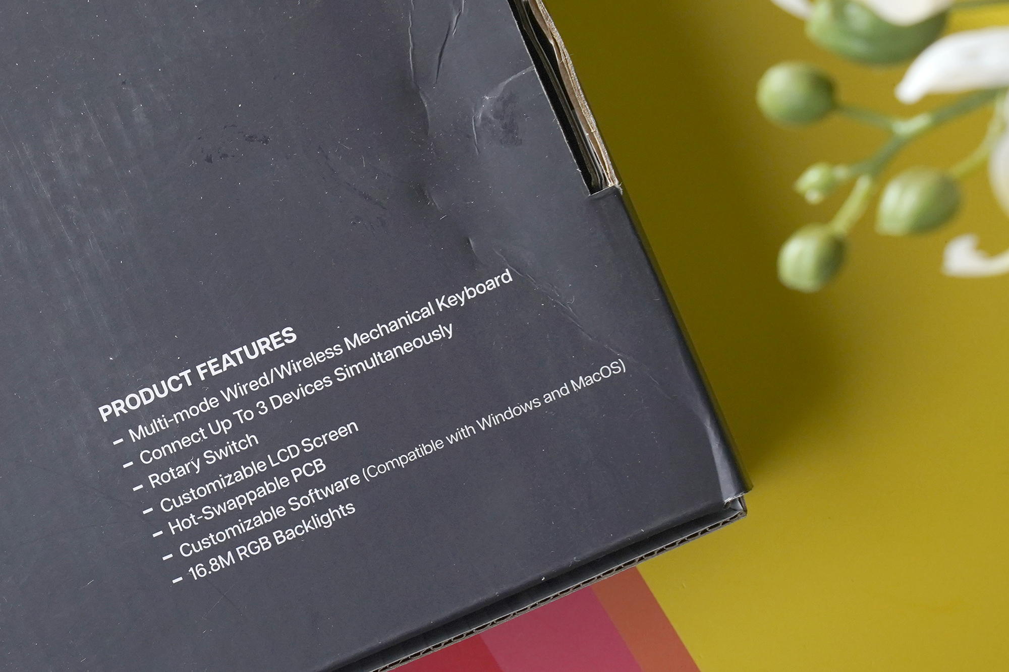 박스의 뒤쪽에는 Epomaker Shadow-X 무선 키보드의 주요 특징이 설명되어 있는데요. 주목해 보아야 할 부분은 최근 유행하고 있는 커스텀할 수 있는 LCD 스크린이 탑재되었다는 점입니다. 잠시 후에 확인해 보겠지만 생각보다 유용한 기능들을 제공합니다.
