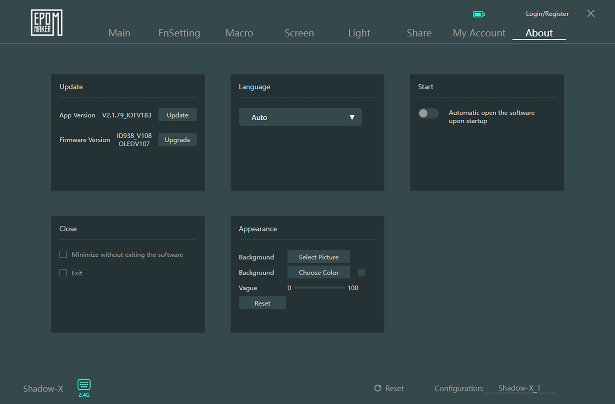 마지막으로 어바웃(About)에선는 앱과 Epomaker Shadow-X 무선 키보드의 펌웨어 버전을 확인하고 업데이트를 할 수 있고 소프트웨어 자체를 윈도우 부팅과 함께 자동 실행될 수 있도록 설정할 수 있습니다.