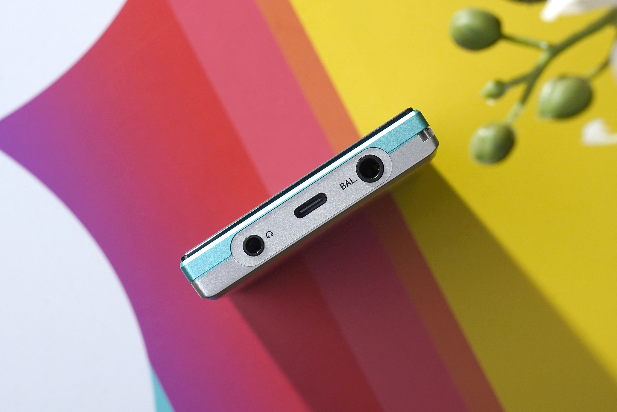 Fiio JM21 안드로이드 DAP의 아래쪽을 살펴보면 3.5mm 헤드폰 출력 / 라인 아웃/ 동축 출력 단자와 USB-C 데이터/충전 포트 그리고 4.4mm 밸런스드 헤드폰 출력 커넥터가 준비되어 있습니다. 그런데 오디오 단자들의 마감이 플라스틱이라는 점은 조금 아쉬운 부분입니다.