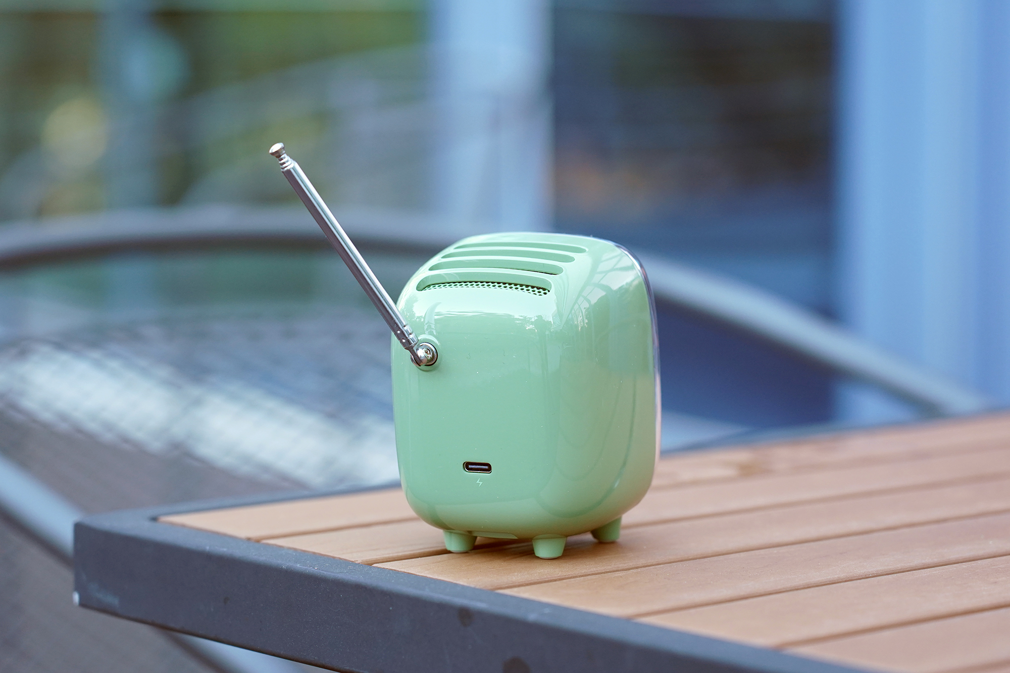 디붐 티부2(Tiivoo-2) 블루투스 스피커의 뒤쪽을 살펴보면 FM 라디오 수신을 위한 안테나 탑재되었데요. 각도나 길이를 조절할 수 있는 구조로 제작되었습니다. 예전에 비슷한 스타일의 FM 라디오나 겸용 카세트 플레이어를 사용해 본 분들이라면 익숙할 것으로 보입니다. 그리고 충전을 위한 USB-C 포트도 아래쪽에 배치되어 있습니다.