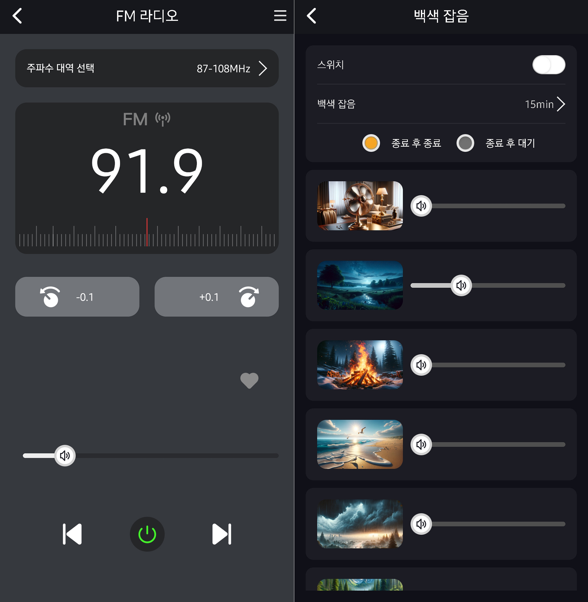그리고 FM 라디오와 백색 잡음 등의 설정도 변경할 수 있는데요. 디붐 티부2(Tiivoo-2) 블루투스 스피커의 작은 화면에서 설정을 진행하는 것보다 상당히 편리합니다.