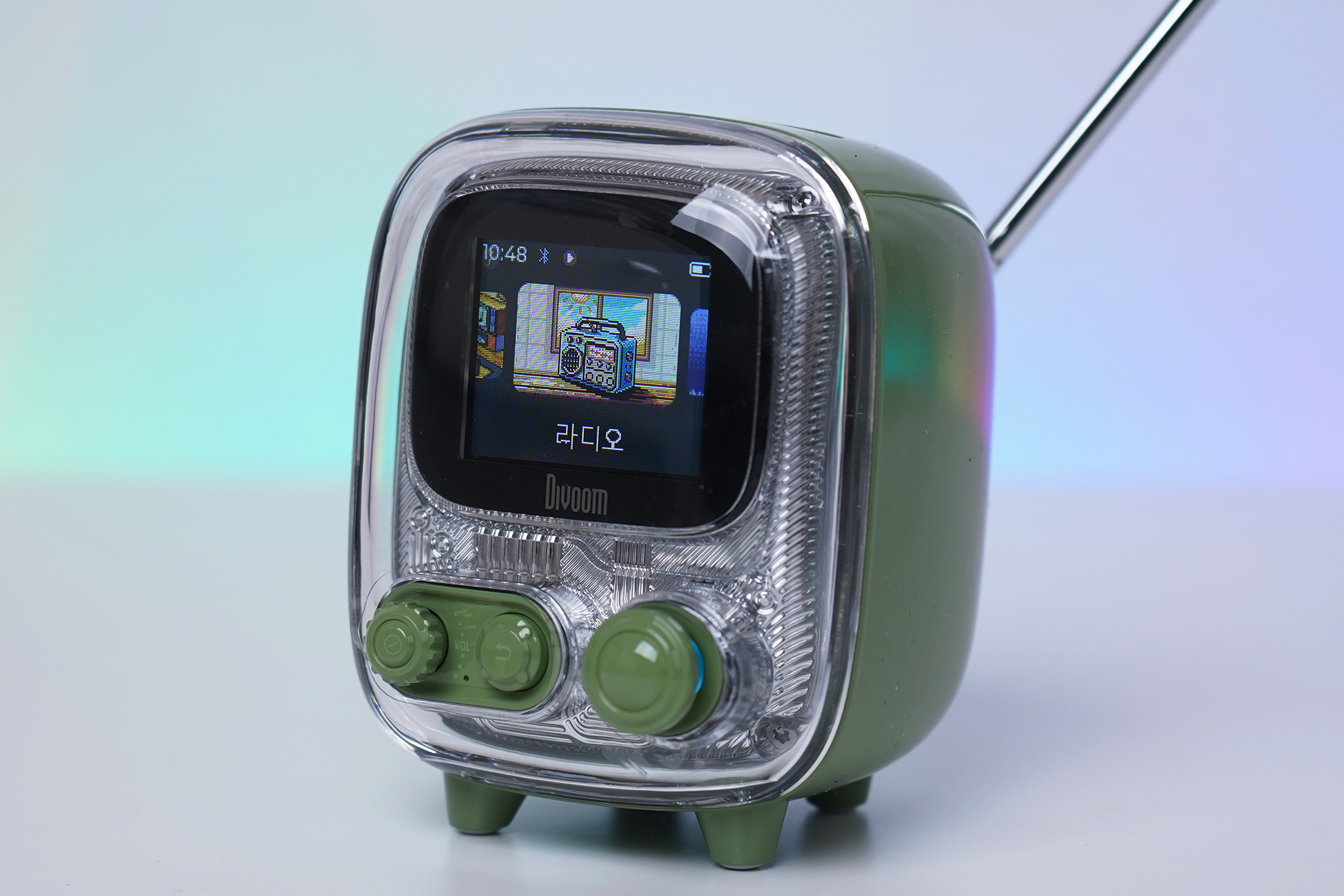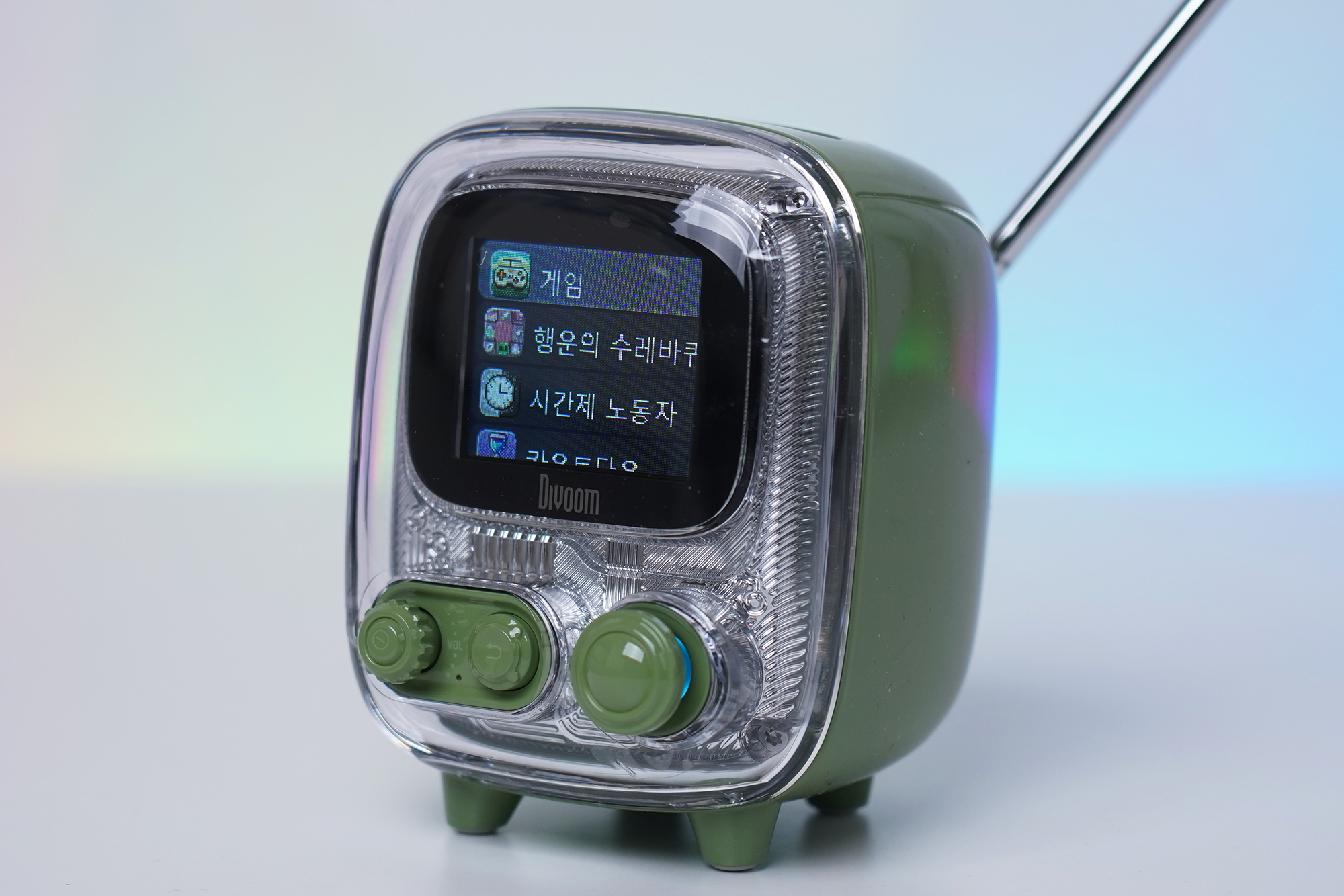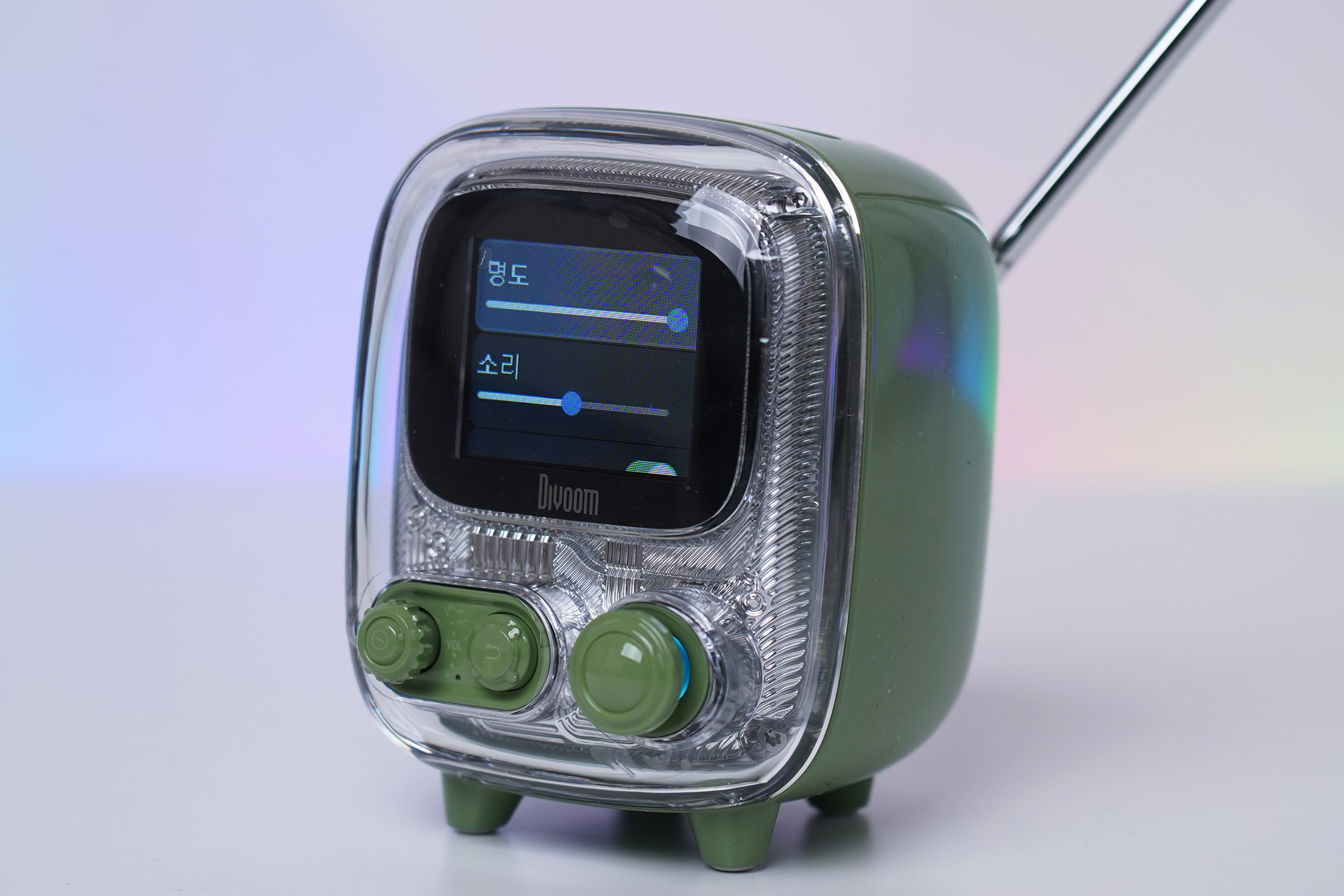 디붐 티부2(Tiivoo-2) 블루투스 스피커의 앞면을 살펴보면 레트로 TV를 형상화한 디자인이 인상적인 편입니다. (애플 iMac G3에서 영감을 받았다고 합니다.) 그리고 아래쪽에 회전 손잡이와 버튼 그리고 4방향 조이스틱이 배치되어 있는데요. 처음에는 버튼의 사용법 직관적이지는 않아서 약간 혼동될 수 있지만 시간이 지나면 어느 정도 적응이 되는 편입니다.