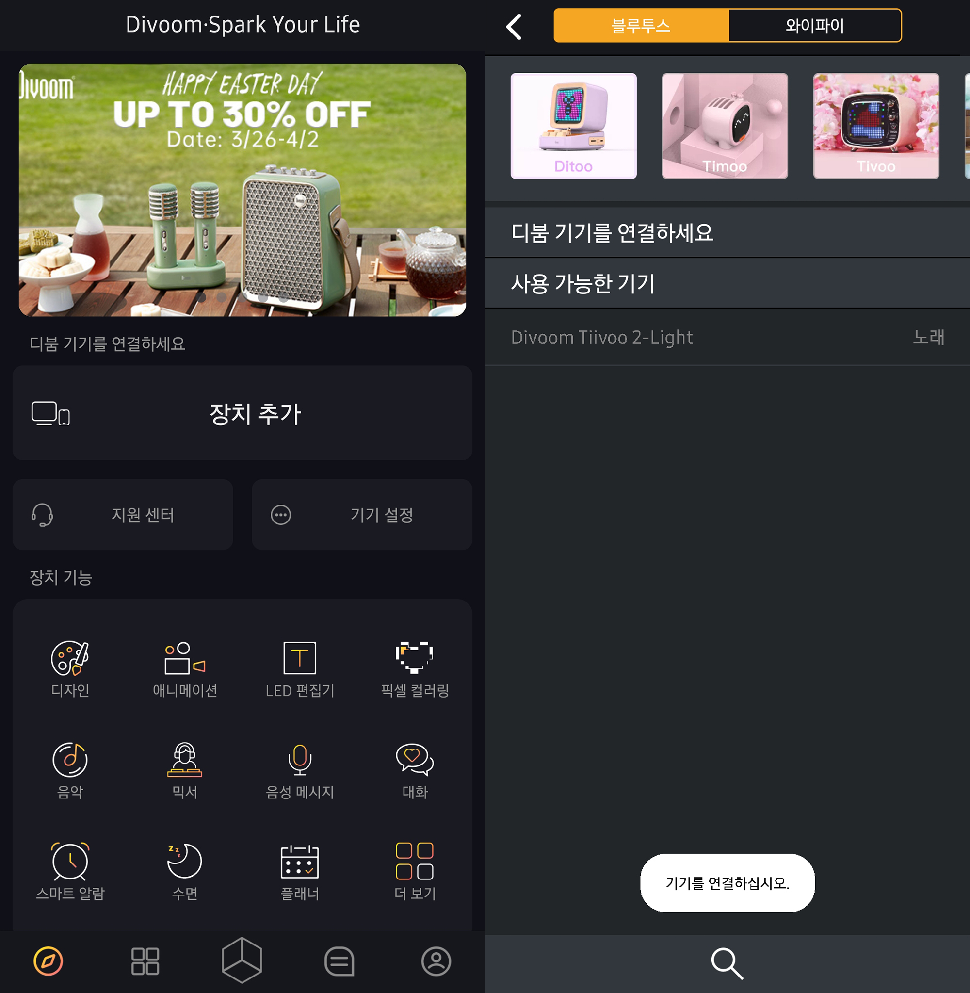 스마트폰과 디붐 티부2(Tiivoo-2) 블루투스 스피커의 페어링 방법은 간단한 편인데요. 디붐 앱을 실행시킨 후에 중간에 배치된 장치 추가를 눌러서 Divoom Tiivoo 2-Light를 선택해 주면 됩니다. 연결 과정 자체는 아주 어려운 부분이 없습니다.