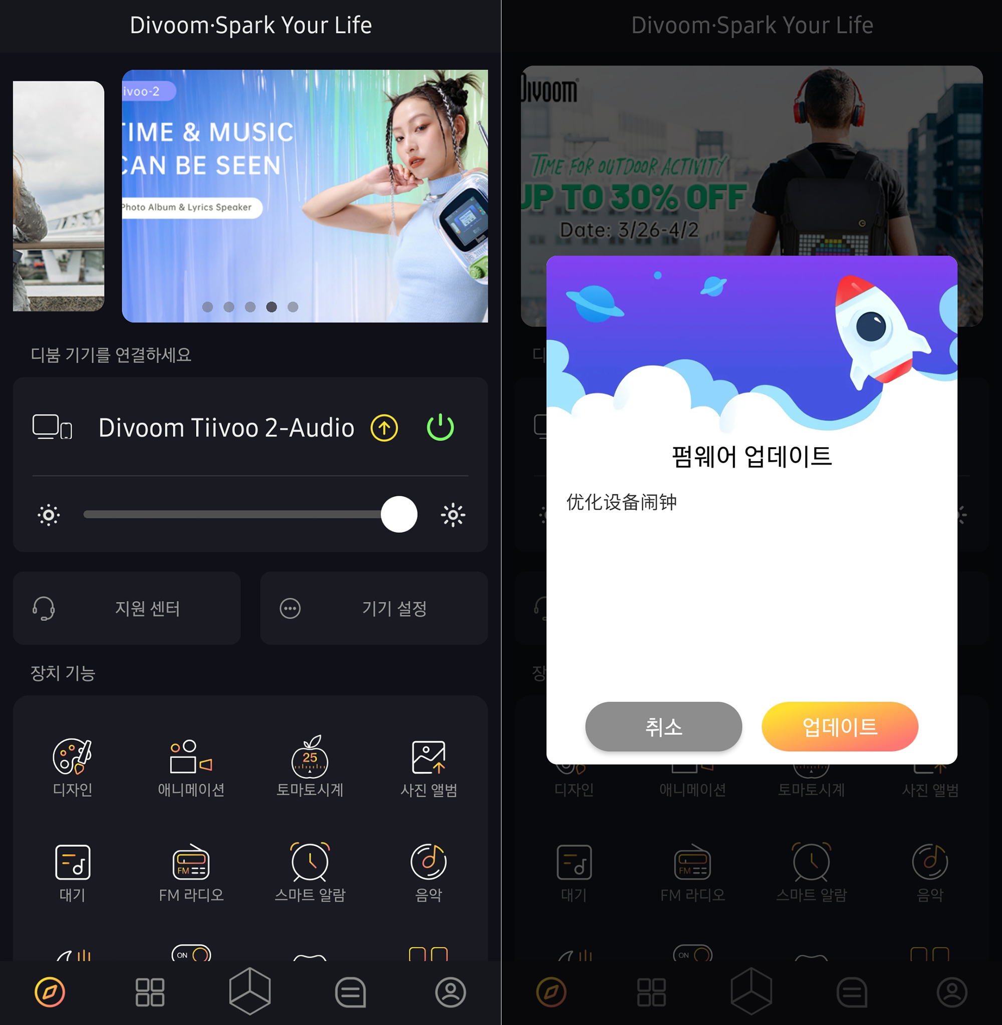 디붐 티부2(Tiivoo-2) 블루투스 스피커는 정말 다양한 기능이 지원되는데요. 우선 내장되어 있는 픽셀 아트 디스플레이를 이용해서 시계처럼 활용할 수 있고 다양한 프리셋도 기본으로 제공됩니다. 전용 앱에서 시계 다운로드 기능도 지원합니다.