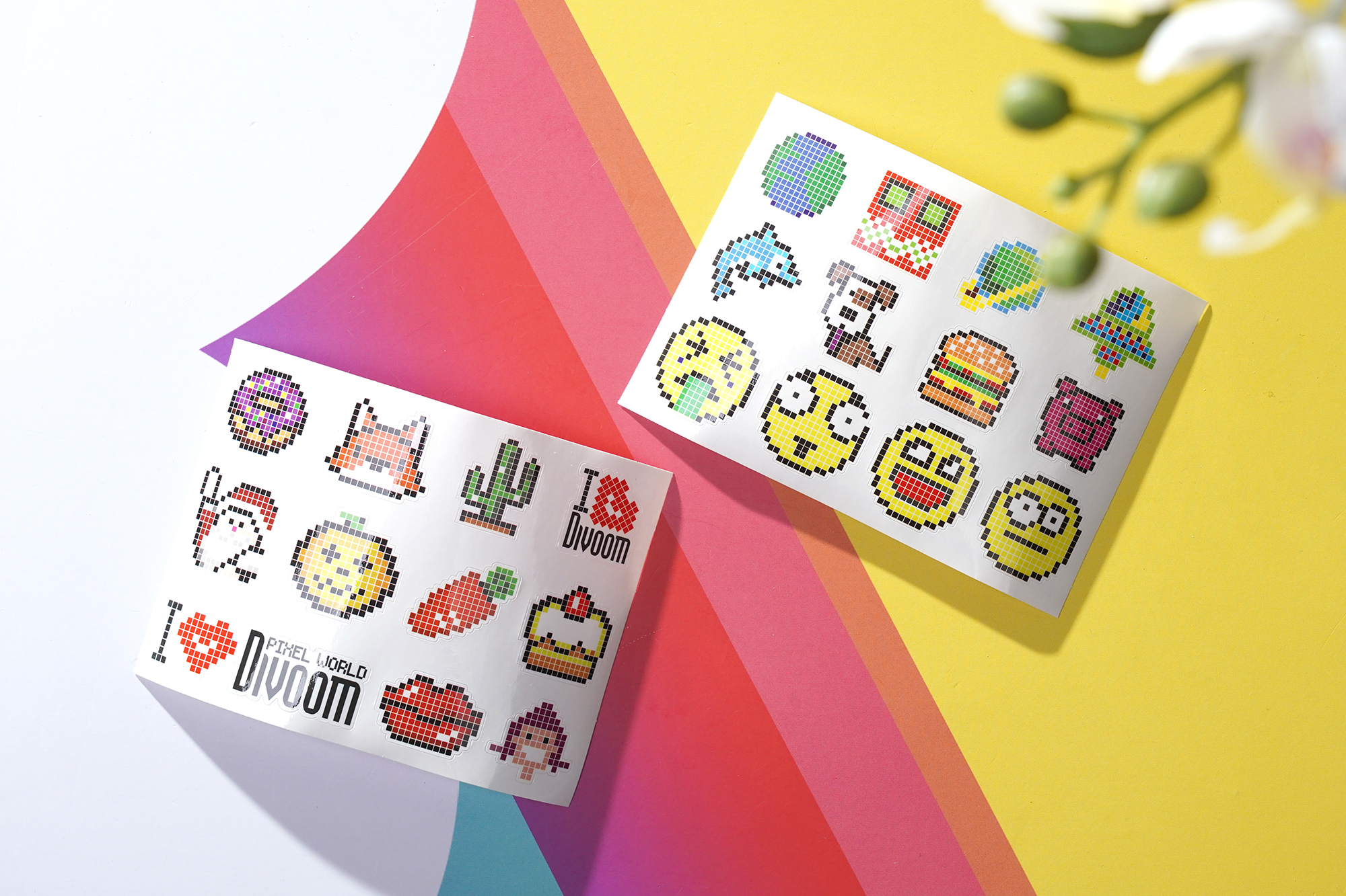 그리고 다이어리나 노트북 다양한 장치에 부착할 수 있는 픽셀 형태의 스티커도 액세서리로 제공됩니다. 사실 디붐의 제품들은 대부분 픽셀 아트를 지원한다는 특징이 있는데요. 심지어는 가방에 픽셀아트 디스플레이를 장착한 제품도 존재할 정도입니다.