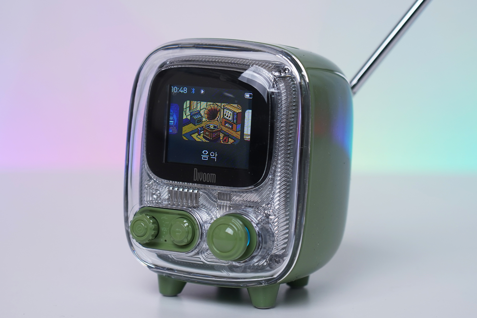 디붐 티부2(Tiivoo-2) 블루투스 스피커의 앞면을 살펴보면 레트로 TV를 형상화한 디자인이 인상적인 편입니다. (애플 iMac G3에서 영감을 받았다고 합니다.) 그리고 아래쪽에 회전 손잡이와 버튼 그리고 4방향 조이스틱이 배치되어 있는데요. 처음에는 버튼의 사용법 직관적이지는 않아서 약간 혼동될 수 있지만 시간이 지나면 어느 정도 적응이 되는 편입니다.