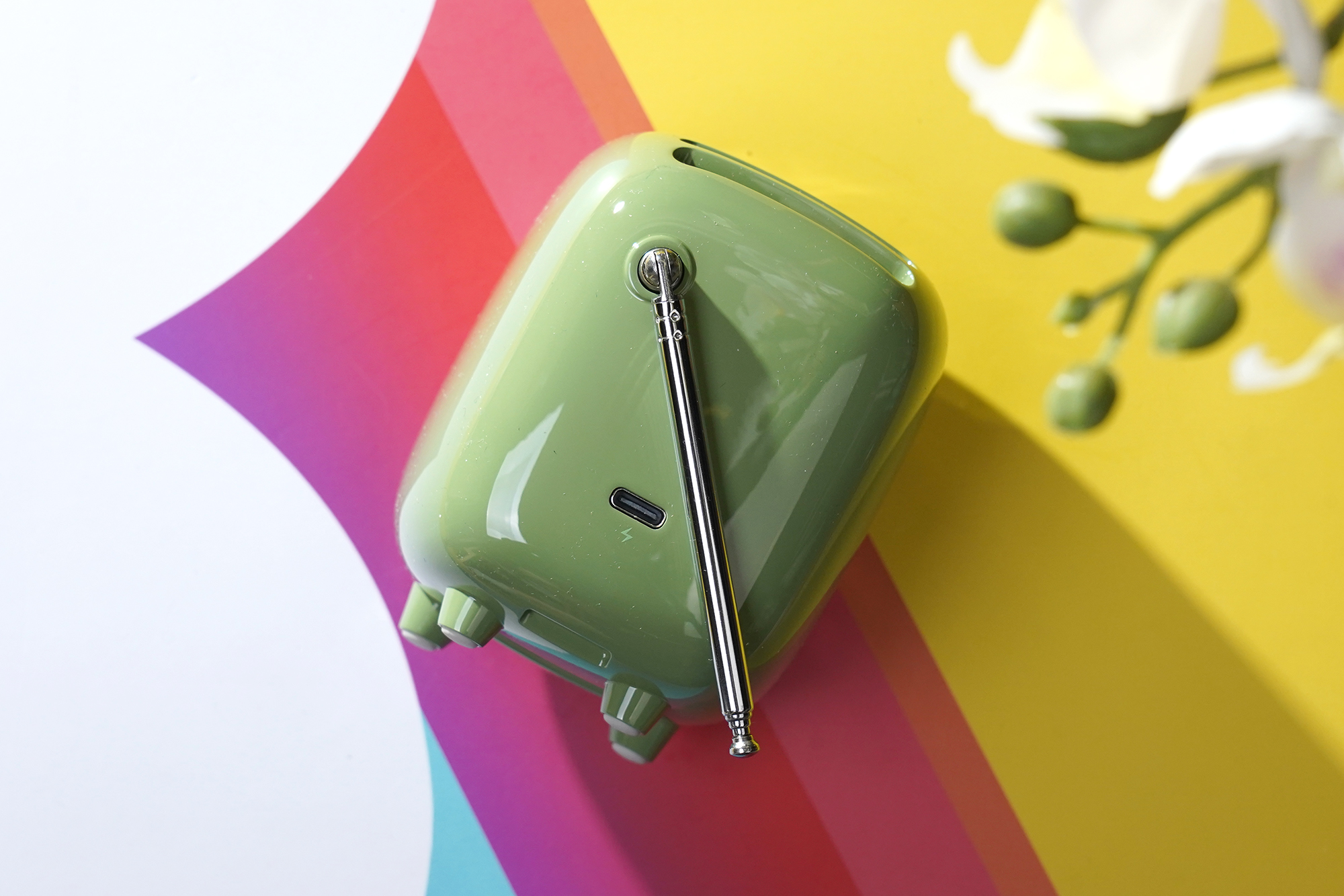 디붐 티부2(Tiivoo-2) 블루투스 스피커의 뒤쪽을 살펴보면 FM 라디오 수신을 위한 안테나 탑재되었데요. 각도나 길이를 조절할 수 있는 구조로 제작되었습니다. 예전에 비슷한 스타일의 FM 라디오나 겸용 카세트 플레이어를 사용해 본 분들이라면 익숙할 것으로 보입니다. 그리고 충전을 위한 USB-C 포트도 아래쪽에 배치되어 있습니다.