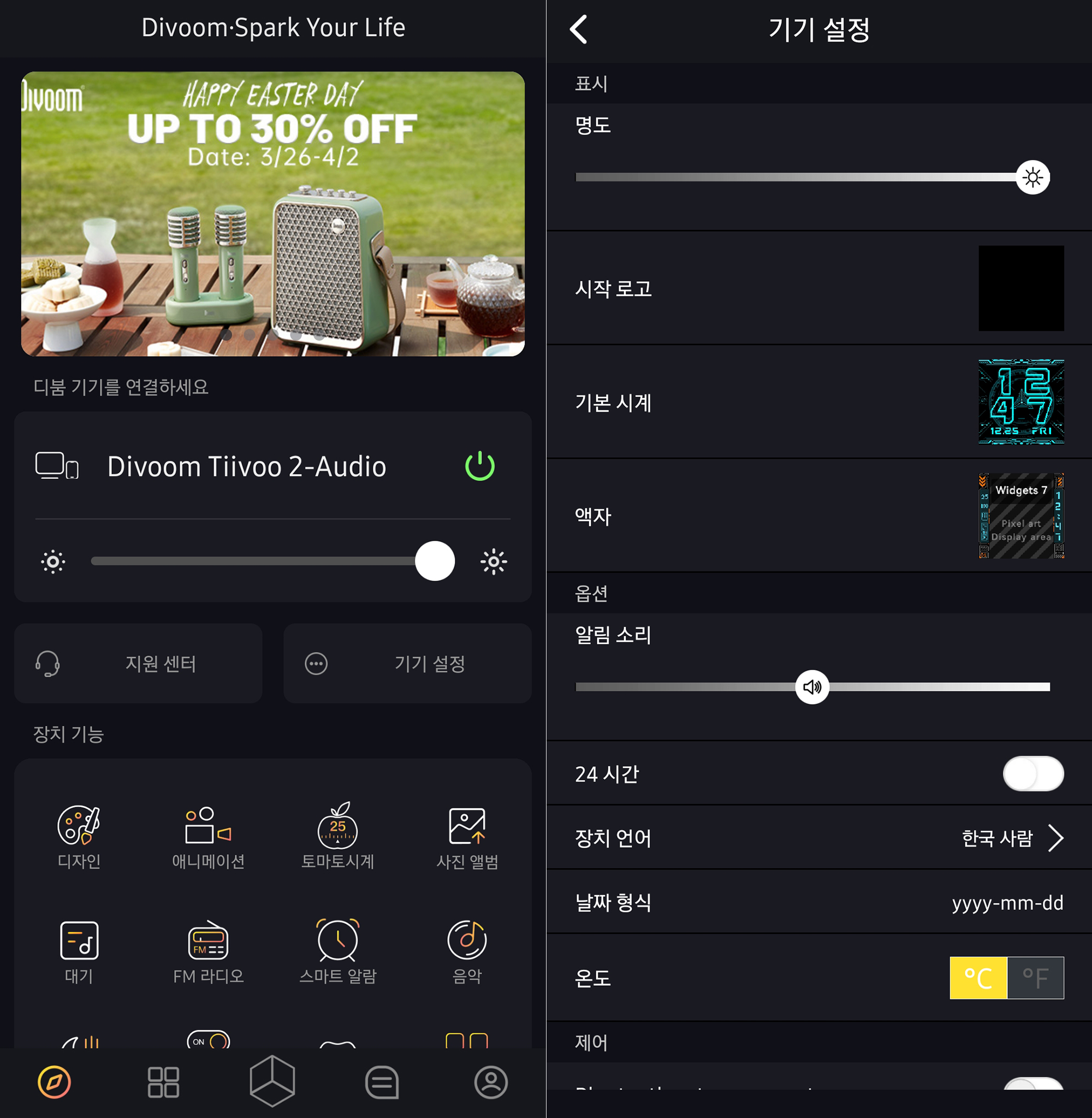 디붐 티부2(Tiivoo-2) 블루투스 스피커는 디붐 앱을 이용해서 기능 대부분을 제어할 수 있는 것은 물론이고 콘텐츠를 추가할 수 있습니다. 우선 기기 설정을 살펴보면 시작 로고와 기본 시계, 액자 알림 소리 등 다양한 메뉴들이 준비되어 있습니다.