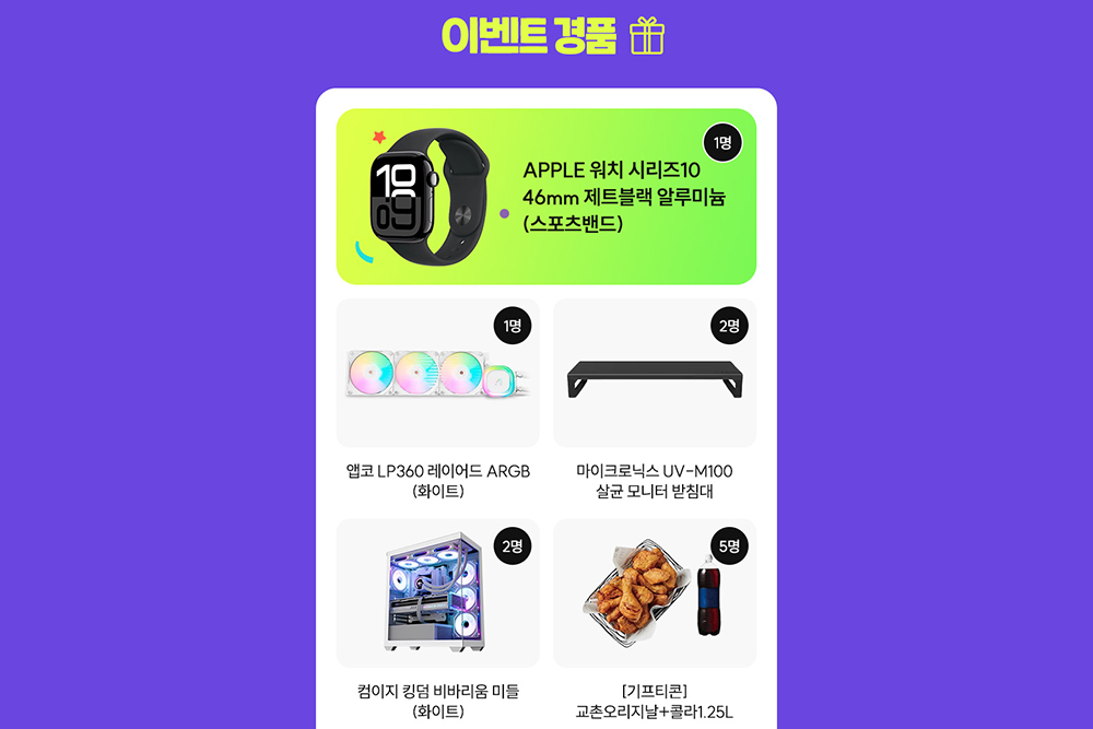 다나와 상품의견 이벤트를 통해서 제공되는 경품을 확인해 보면 애플워치 시리즈10 46mm 제트블랙 알루미늄(스포츠밴드)과 앱코 LP360 레이어드 ARGB(화이트), 마이크로닉스 UV-M100 살균 모니터 받침대, 컴이지 킹덤 비바리움 미들(화이트), 교촌오리지날+콜라1.245L, 투썸 떠먹는 티라미수+아메리카노, 네이버페이 5천원 등이 제공됩니다. 경품이 상당히 푸짐한 것을 확인할 수 있습니다.