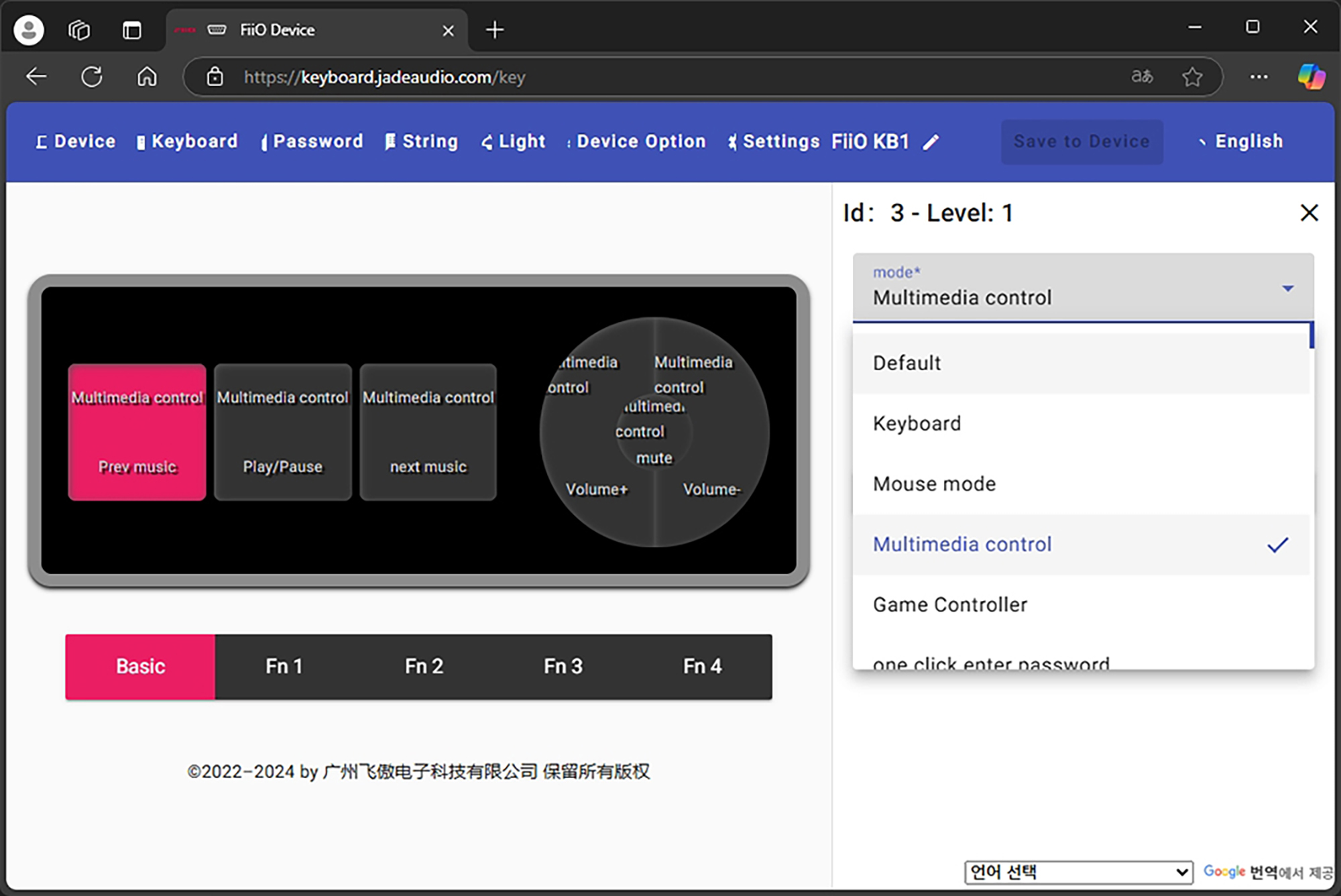 FiiO KB1K 멀티미디어 리모컨 키보드에 탑재된 RGB LED 모드나 색상을 변경할 수 있습니다. 그리고 설정이 완료되면 오른쪽 위에 있는 Save to Device 눌러서 저장을 하면 설정이 계속 유지됩니다.