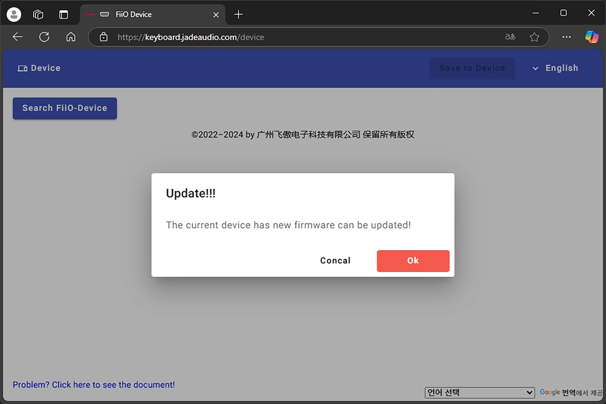 웹 사이트에 접속한 후에 오른쪽 위에 있는 언어를 English로 설정하고 Search FiiO-Device 버튼을 눌러서 FiiO KB1을 페어링 해주면 펌웨어 업데이트가 진행됩니다. M17과 같은 FiiO의 다른 DAC와 DAP와 같은 디바이스에 연결할 수 있는 기능들이 추가되었다고 합니다. 그렇지만 전체적으로 웹사이트의 완성도나 번역의 그렇게 높다고 생각되지는 않았습니다.