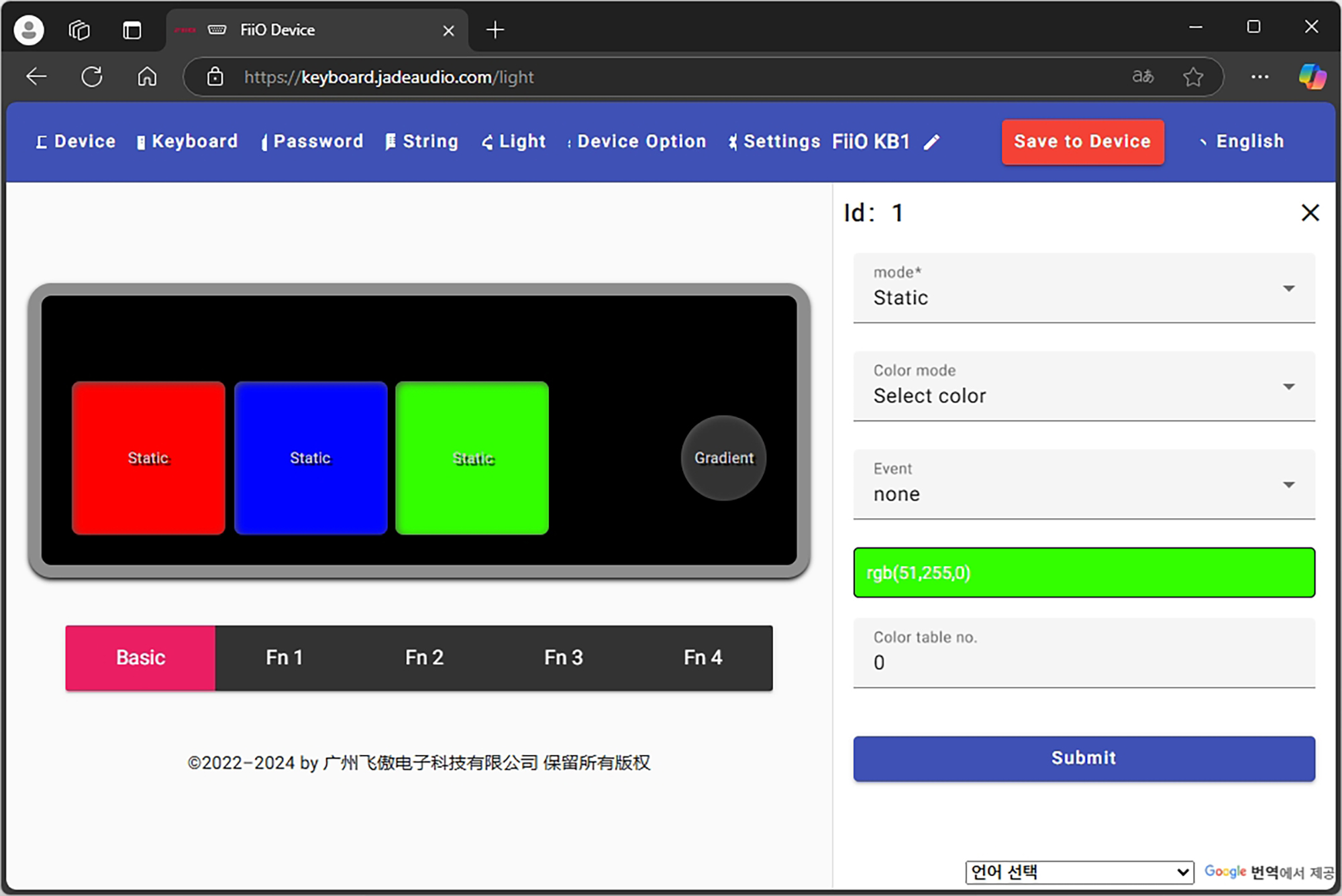 FiiO KB1K 멀티미디어 리모컨 키보드에 탑재된 RGB LED 모드나 색상을 변경할 수 있습니다. 그리고 설정이 완료되면 오른쪽 위에 있는 Save to Device 눌러서 저장을 하면 설정이 계속 유지됩니다.
