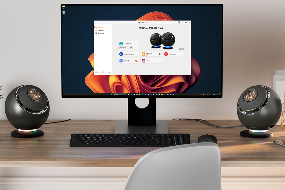 페블 노바 USB 스피커는 PC와 USB 방식으로 연결됩니다. 그리고 재미있는 부분은 RGB 조명이 탑재되어 있다는 점입니다. 전용 크리에이브 앱을 통해서 설정을 변경할 수 있다고 합니다.