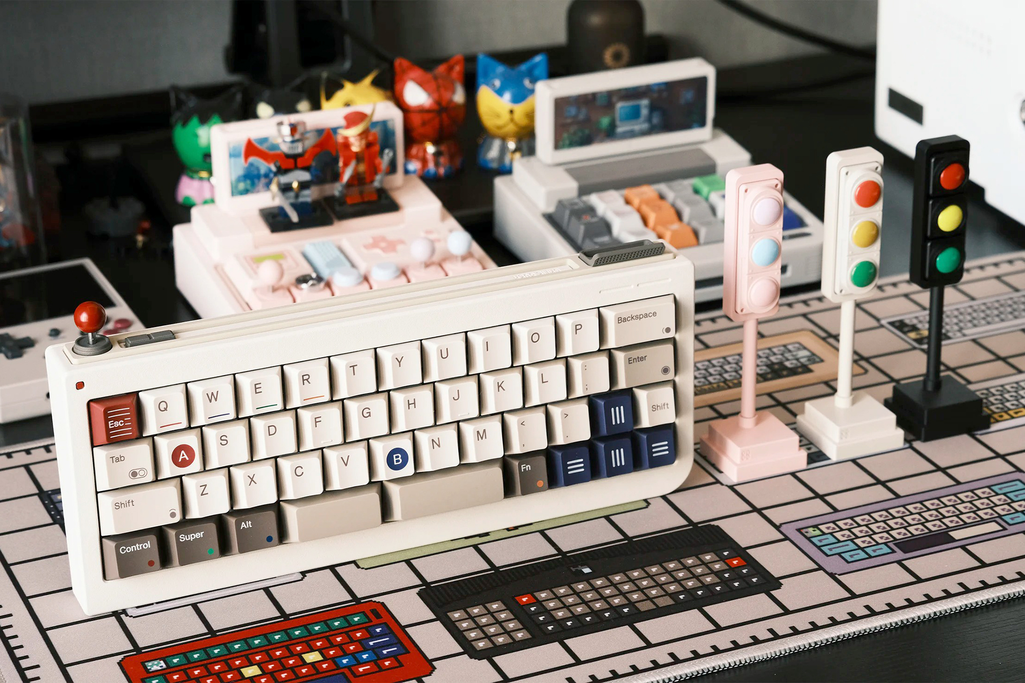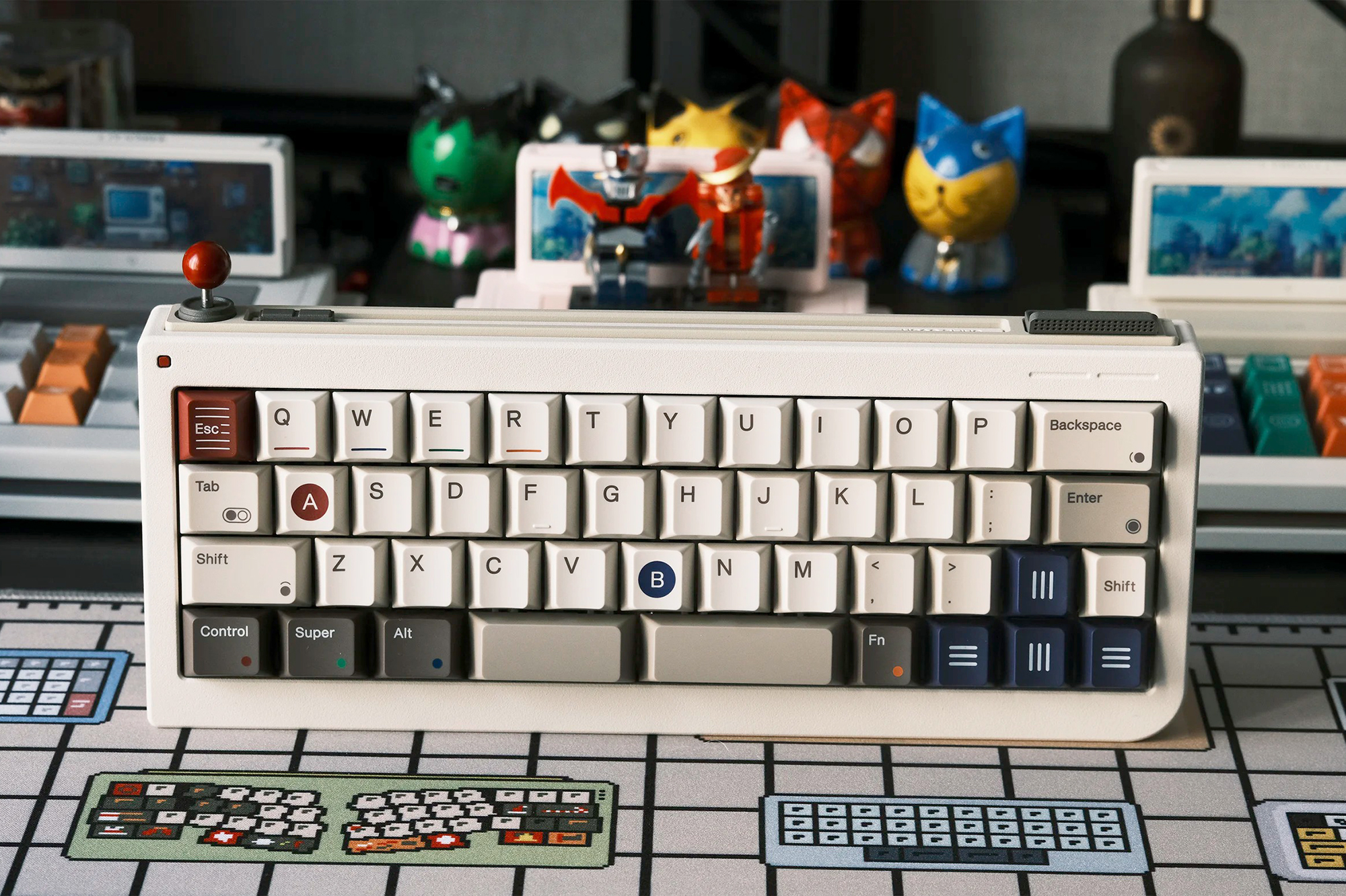 Game1989 GB40 40% 커스텀 키보드는 상당히 콤팩트한 레이아웃으로 제작되었고 재미있는 부분은 방향키가 탑재되어 있어서 편리하게 활용할 수 있다는 점입니다. 그리고 위쪽에 자석으로 고정되는 빨간색 조이스틱이 배치되어 있다는 점이 디자인적인 포인트입니다. 그리고 구조를 최근에 유행하고 있는 가스켓이 적용되었고 VIA 역시도 지원합니다. 그리고 최신 커스텀 키보드의 트랜드라고 할 수 있는 USB 유선, 2,4G 무선, 블루투스 3 in 1 모드를 지원합니다.