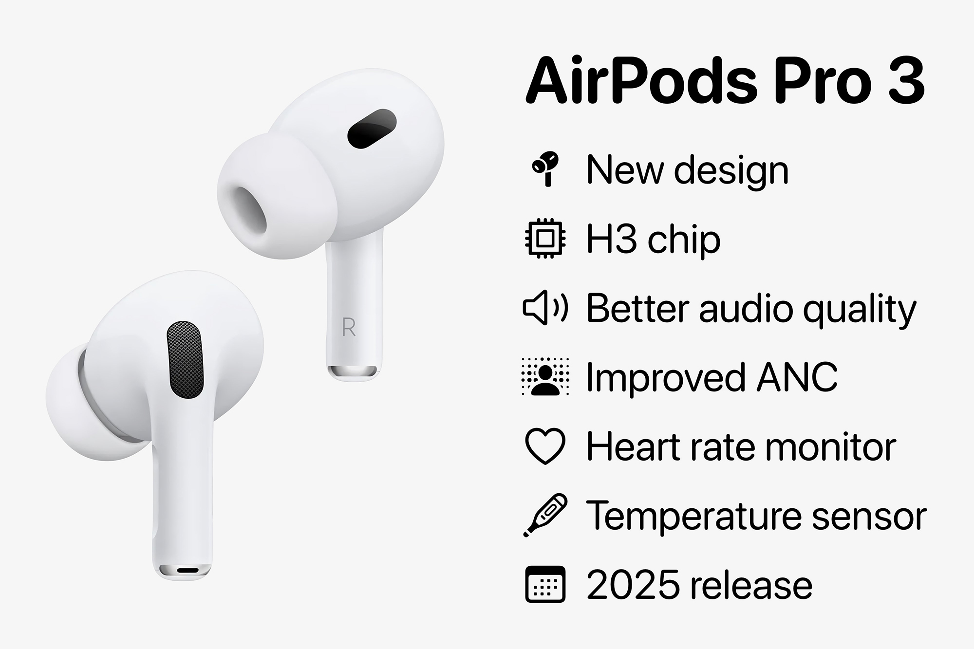 제가 주목하는 에어팟 프로3 블루투스 이어폰의 경우에는 새로운 디자인이 적용되고 H3 칩이 탑재됩니다. 그 외에도 음질은 좋아지고 ANC(액티브 노이즈 캔슬링) 성능도 더욱 좋아질 것으로 보입니다. 핵심은 심박수와 체온까지 측정할 수 있다고 합니다. 참고로 2025년 연발에 출시일이 예정되어 있습니다.