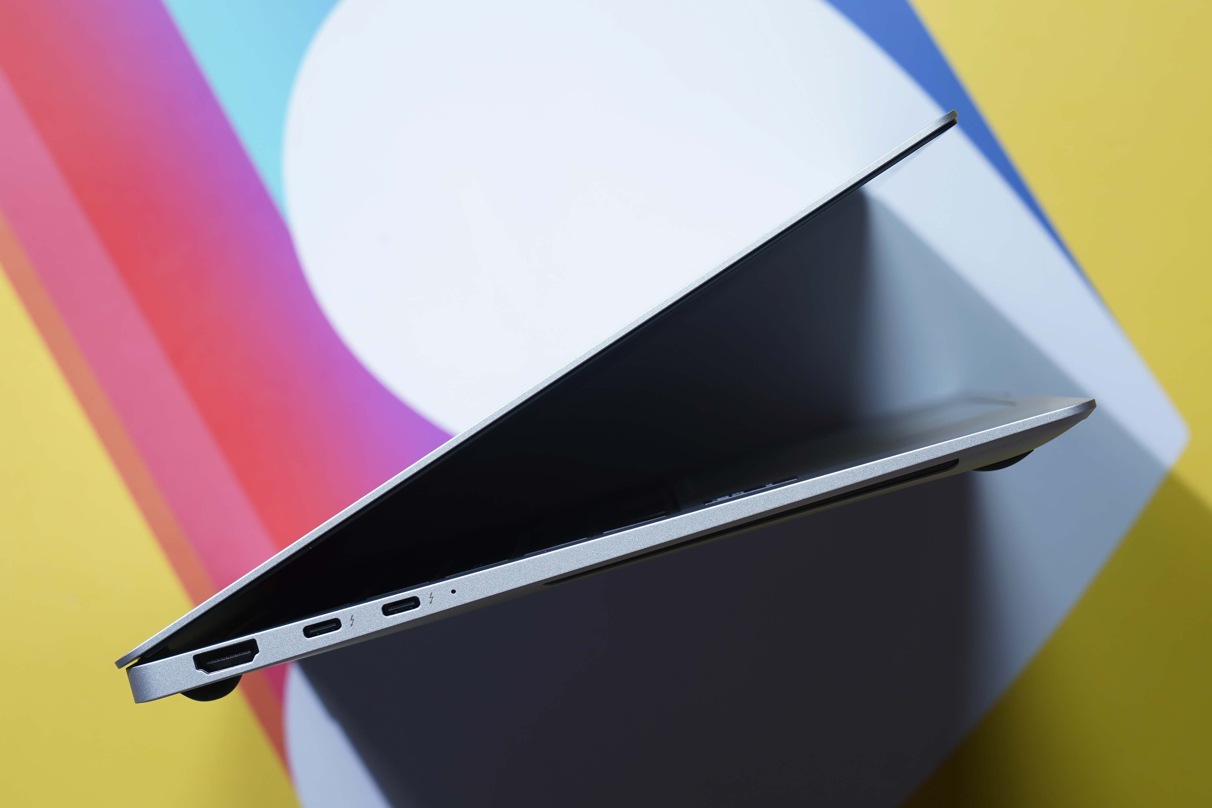 삼성 갤럭시북5 프로 14인치 노트북의 입출력 포트를 살펴보면 왼쪽에는 HDMI 2.1과 2개의 썬더볼트4가 탑재되었고 반대쪽에는 마이크로SD카드 슬롯과 USB-A 3.2 그리고 3.5파이 이어폰/마이크 단자가 배치되어 있습니다. 확장성은 준수한 수준이라고 생각되었습니다.
