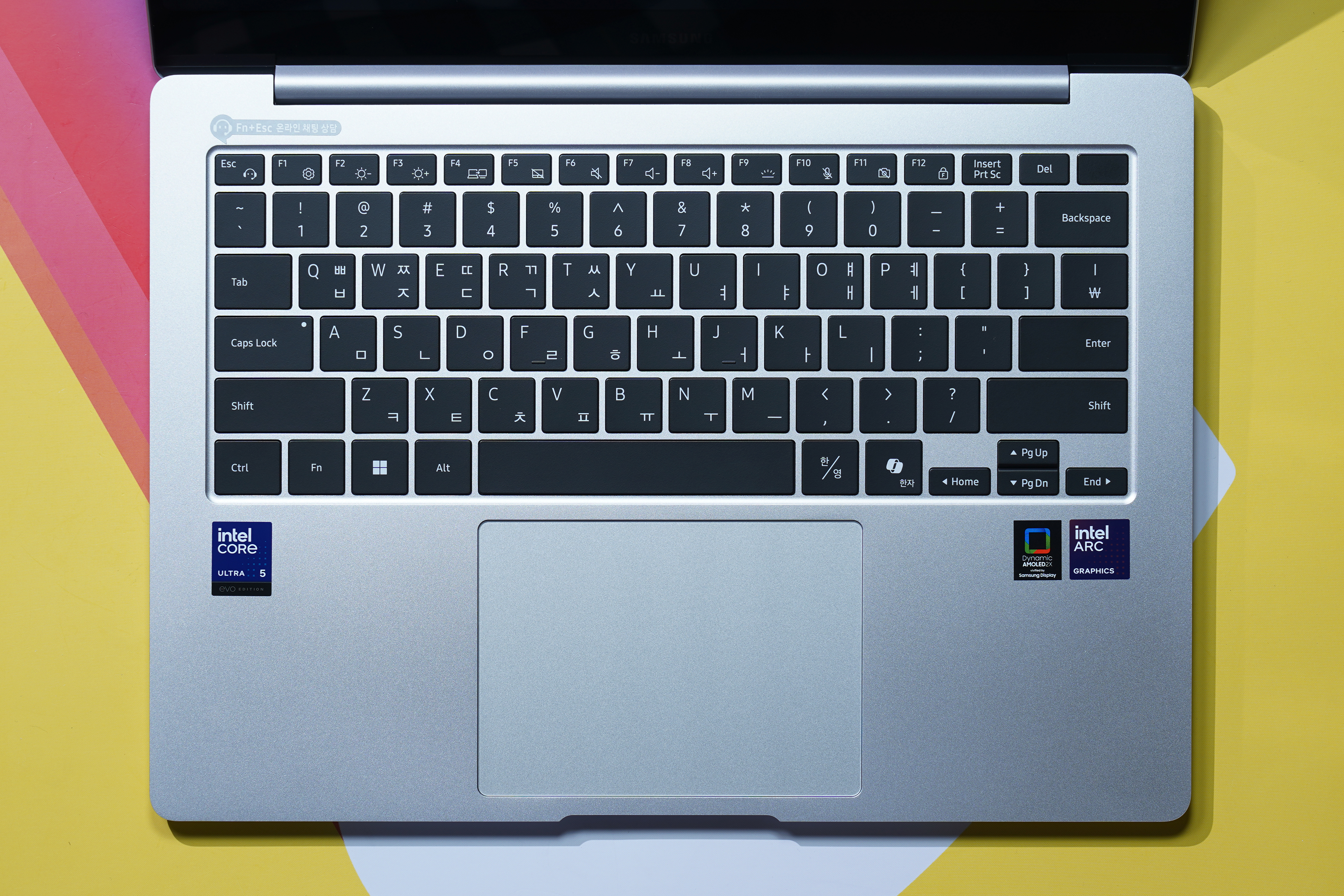 삼성 갤럭시북5 프로 14인치 노트북의 키보드를 확인해 보면 14인치 노트북이라서 별도의 숫자 키패드가 탑재되지는 않았습니다. 그리고 오른쪽 위에 지문인식 전원 버튼이 탑재되었고 이전 세대에는 없던 Copilot(코파일럿) 전용 키가 배치되어 있다는 점도 흥미 있는 부분입니다. 마지막으로 키감은 의외로 준수한 편이라고 생각되었습니다.