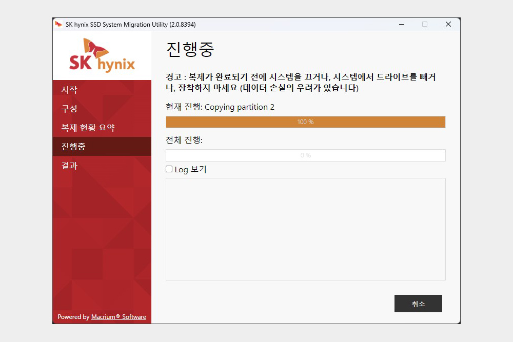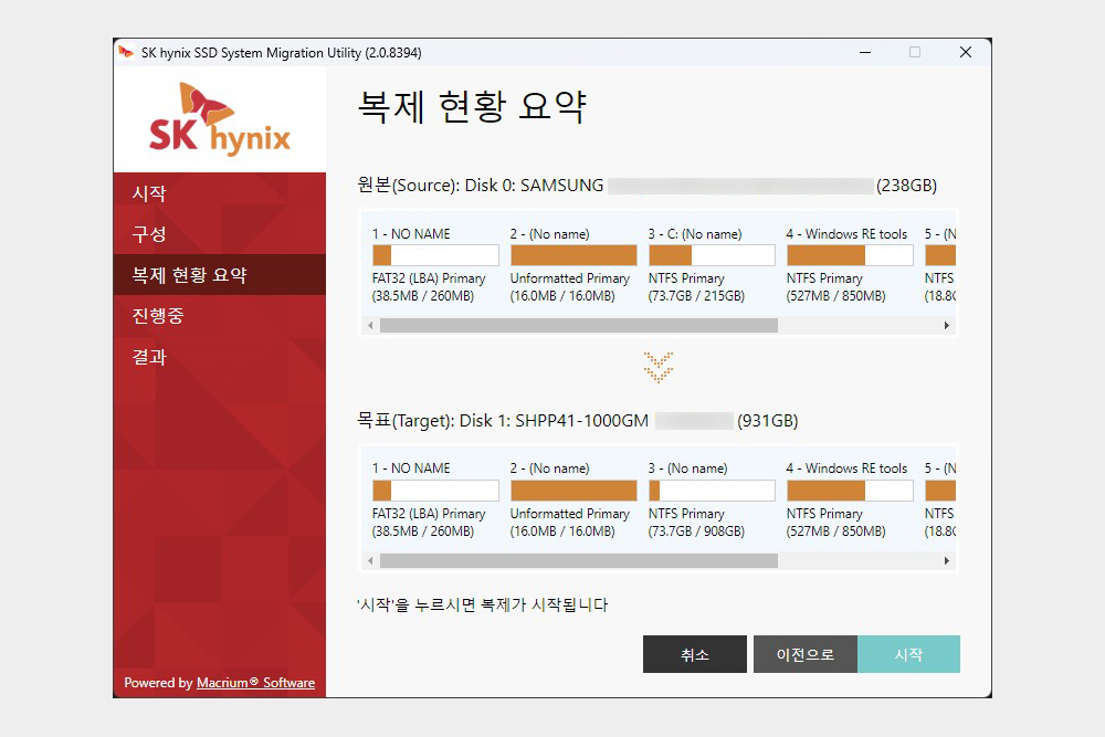 시작을 누르면 갤럭시북5 프로 노트북에 설치되어 있는 PM9A1 SSD의 파티션이 SK하이닉스 P41에 그대로 복제가 진행되는 것을 확인할 수 있습니다. 상당한 시간이 소요될 수 있으니 가능하면 노트북에 어댑터를 연결한 상태로 진행하는 것을 추천합니다.