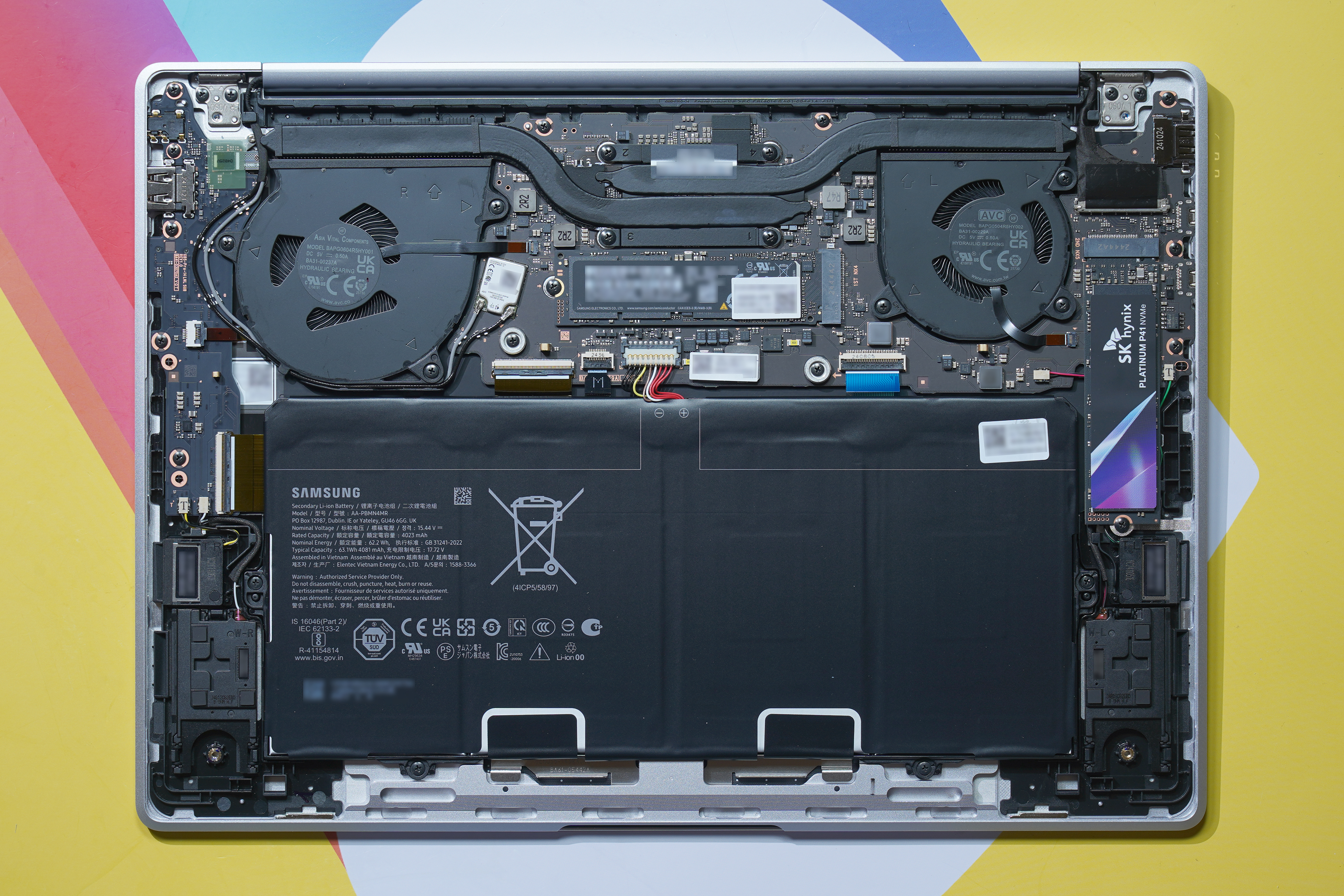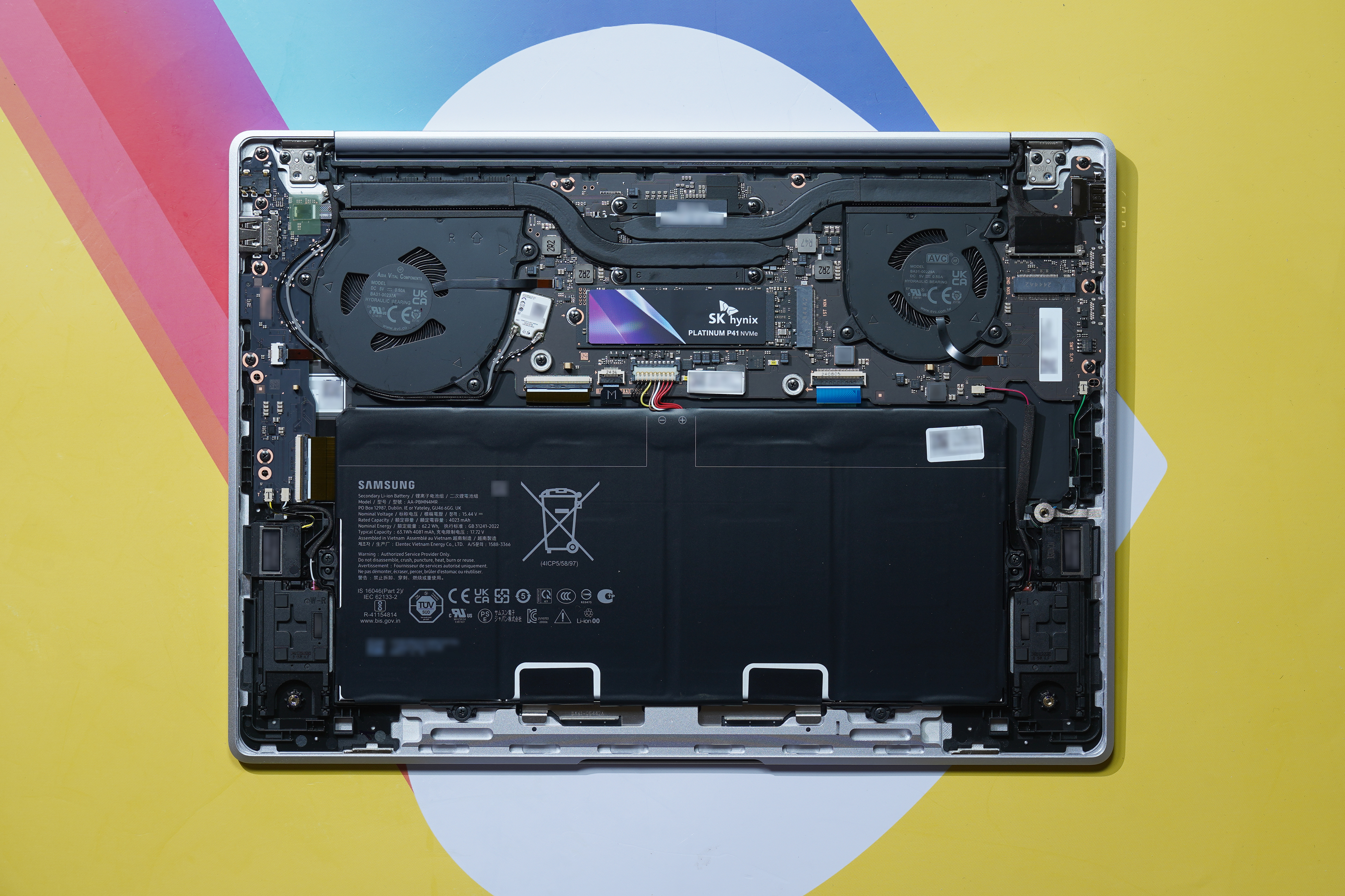 삼성 갤럭시북5 프로의 내부를 확인해 보면 14인치 모델이라서 약간 타이트하게 제작된 것을 확인할 수 있습니다. 그리고 기본으로 장착된 제품은 PM9A1이라는 제품으로 PCIe 4.0을 지원합니다.