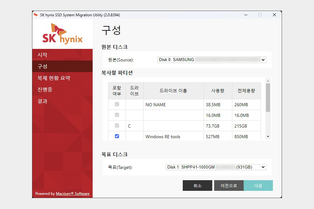 마이그레이션 소프트웨어의 사용 방법은 간단한 편인데요. 다음을 누르면 현재 원본 디스크의 파티션 상태를 확인할 수 있고 아래쪽에 목표 디스크가 표시되는 것을 확인할 수 있습니다. 일부 파티션의 경우에는 선택적으로 복사할 수 있습니다.