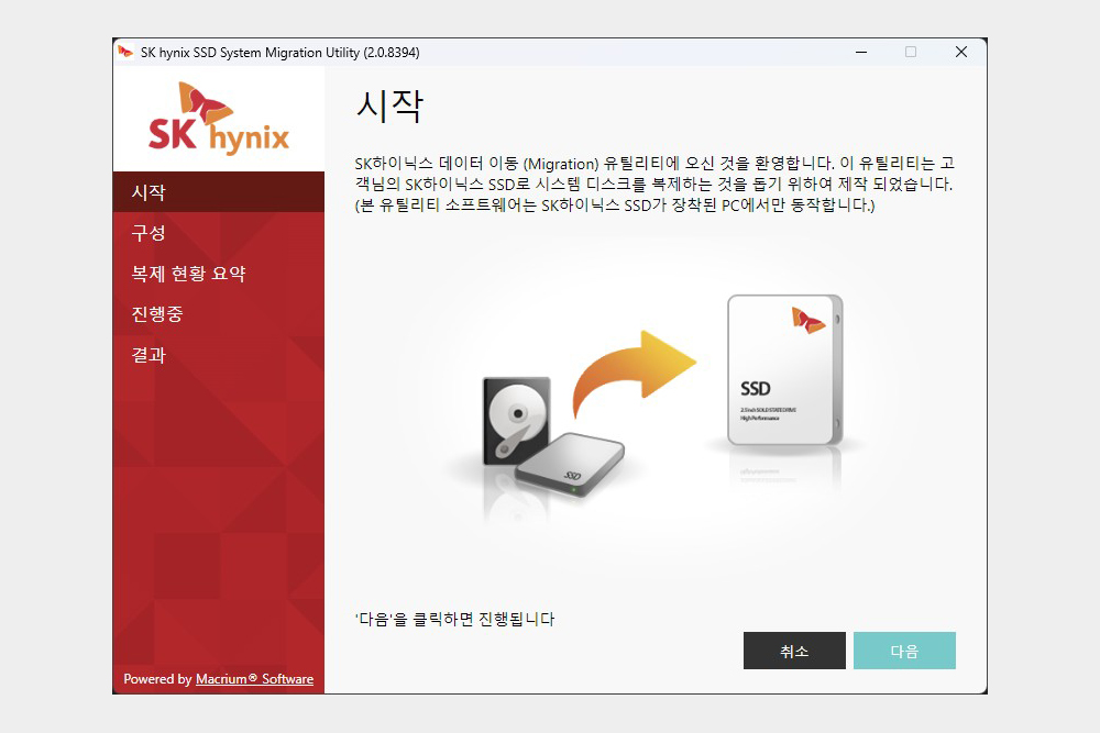 노트북의 SSD 마이그레이션을 하기 위해서는 우선 SSD 제조사에서 제공하는 소프트웨어가 필요합니다. SK하이닉스에서는 Macrium 소프트웨어의 Clone Tool이라는 제품이 제공됩니다. 프로그램을 다운로드 받고 SKHSSD.EXE라는 파일을 실행시키면 됩니다.