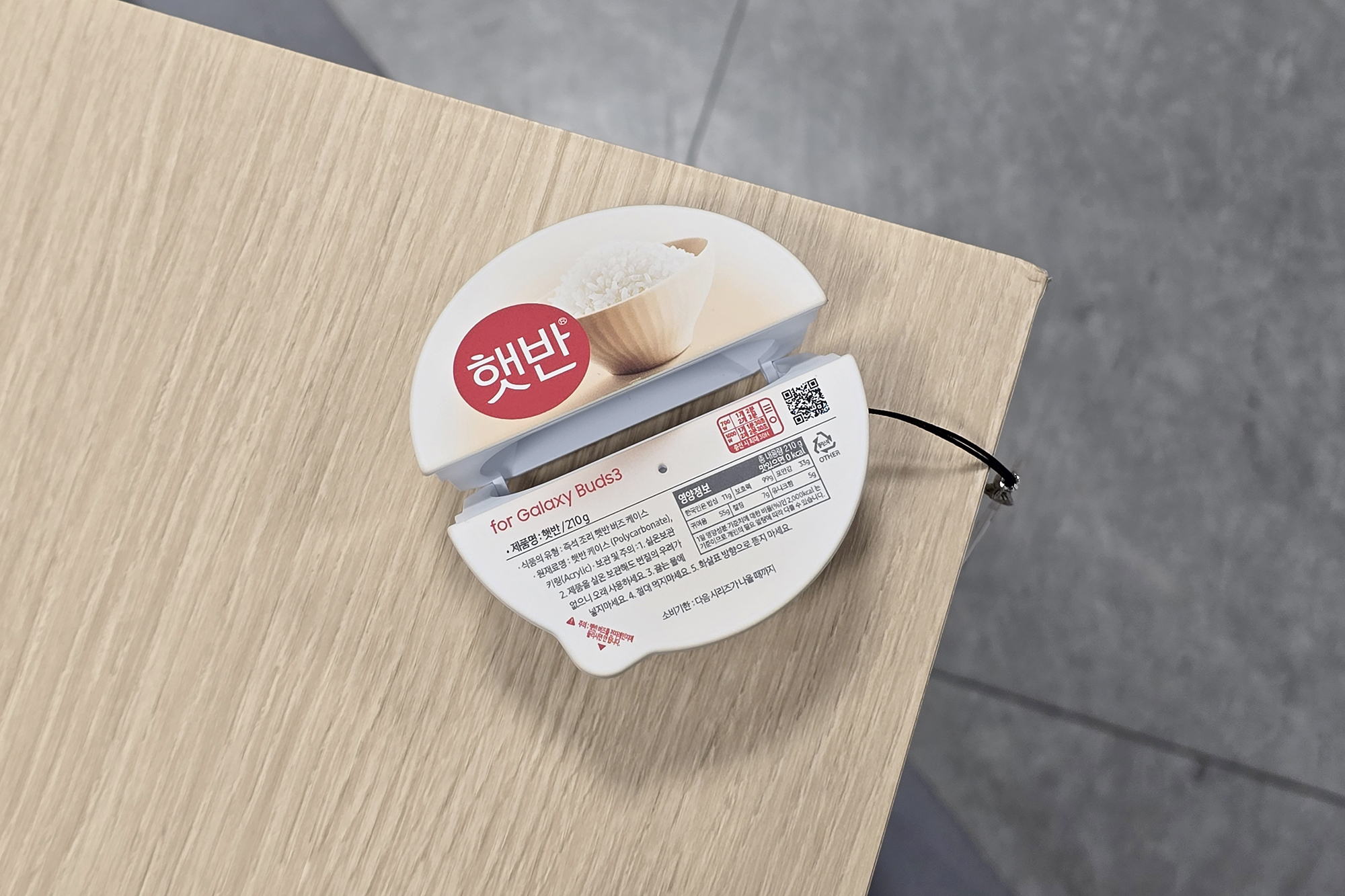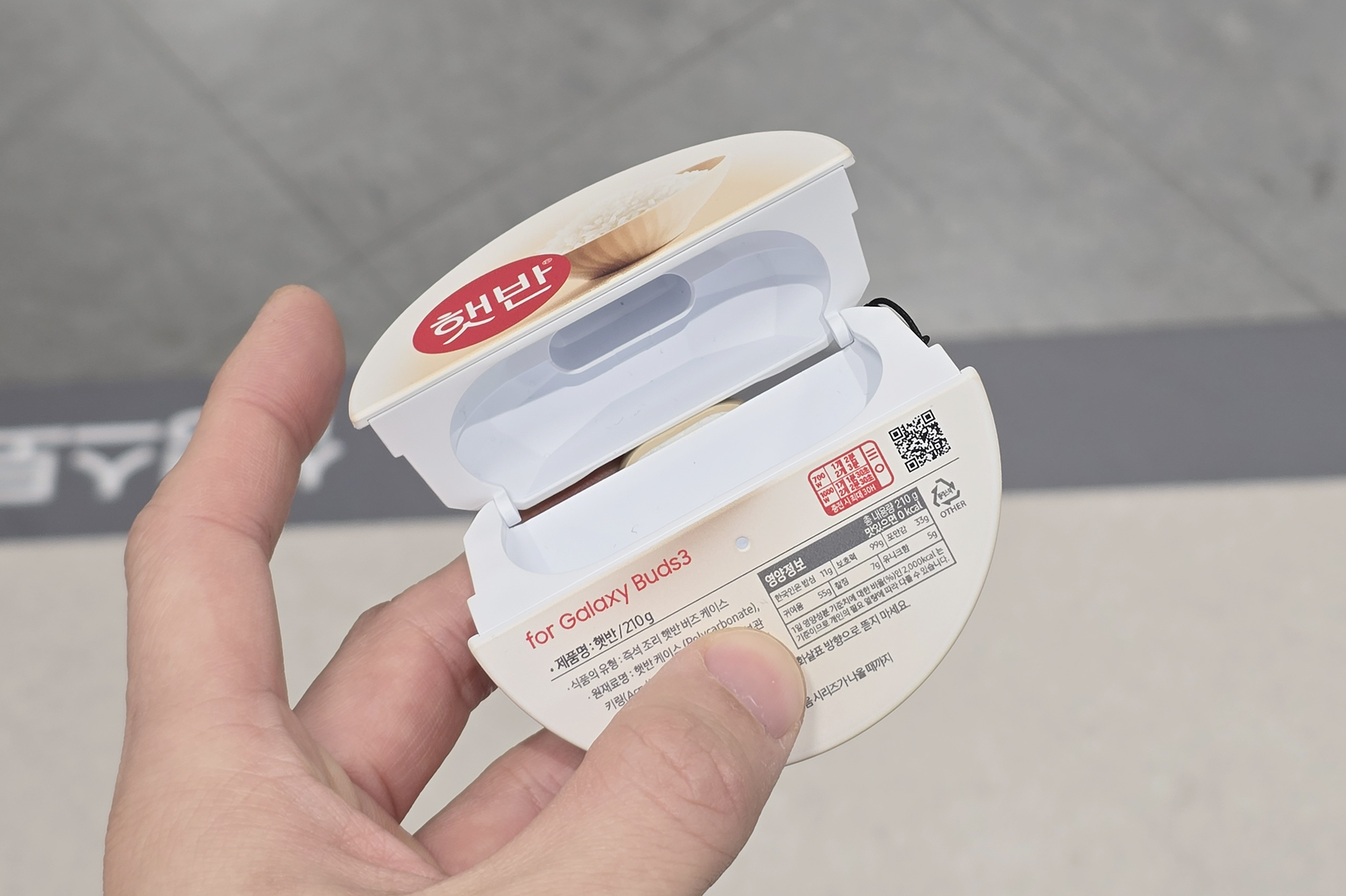갤럭시 버즈3 / 프로 햇반 백미 케이스는 실제 햇반 케이스와 같은 귀여운 형태로 제작된 것을 확인할 수 있습니다. 그리고 상단에 적혀있는 문구들이 재미있는데요. for Galaxy Bud3, 즉석 조리 햇반 버즈 케이스, 총 내용량 210g, 맛있으면 0kal, 소비기한 : 다음 시리즈가 나올 때까지, 등입니다.