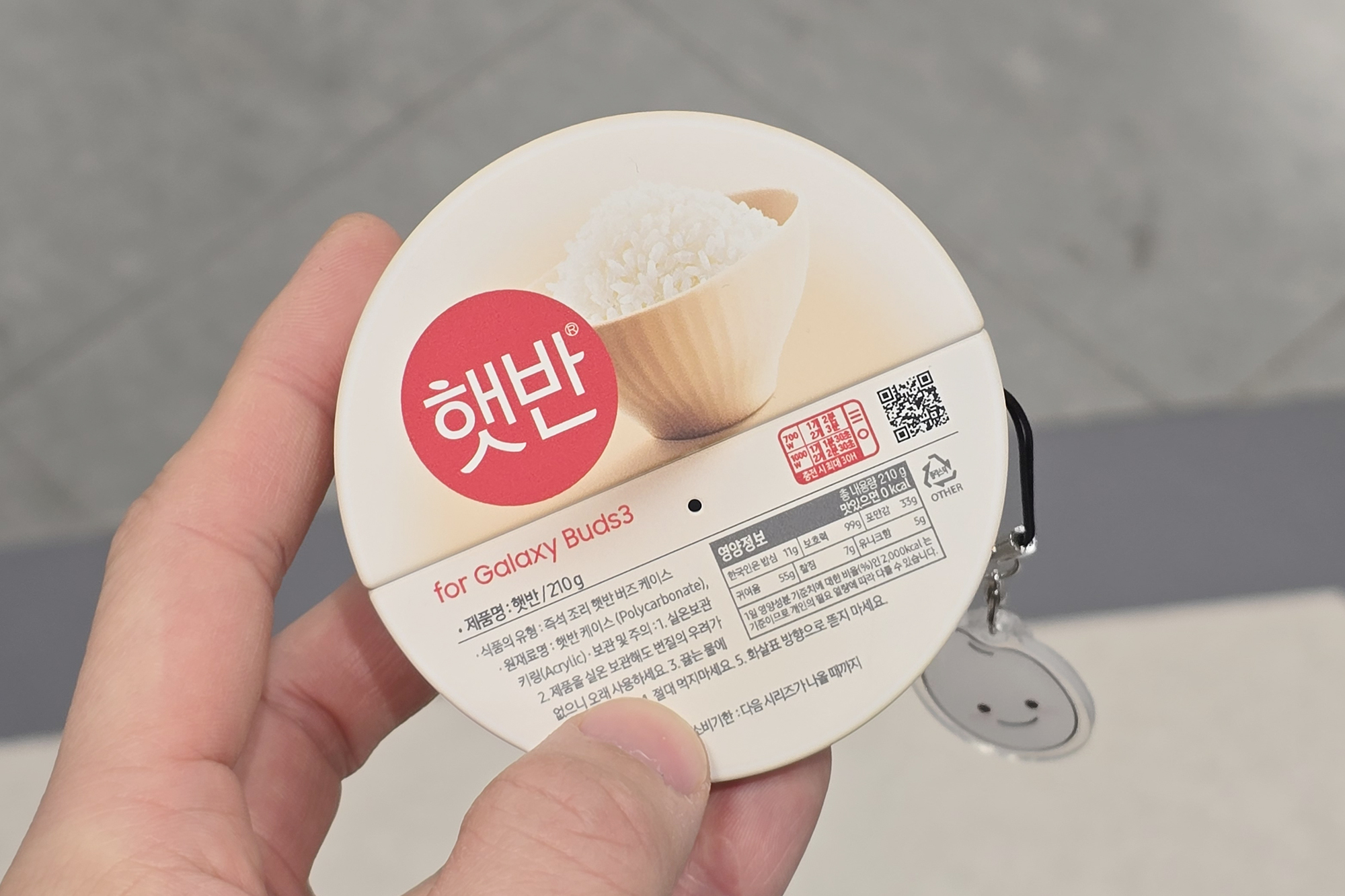 갤럭시 버즈3 / 프로 햇반 백미 케이스에는 쌀알 모양의 키링이 하나 포함되어 있습니다. 상당히 귀여운 형태라고 생각되었습니다. 사실 한국 사람은 밥심이라는 문구와 매칭이 좋은 것 같습니다.