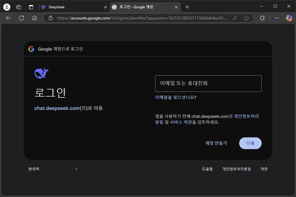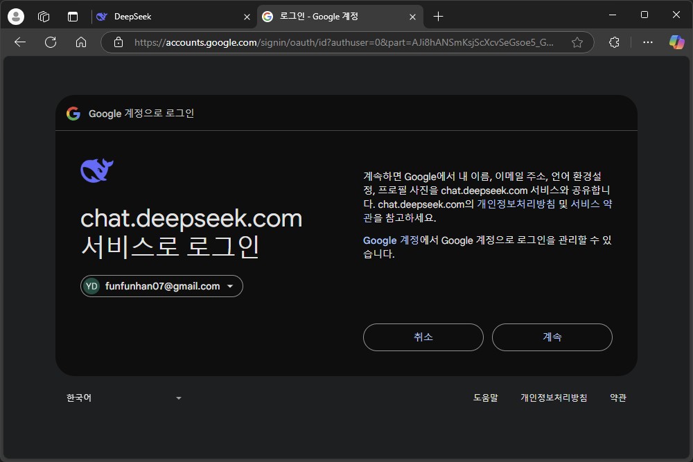 구글 계정을 선택하면 chat.deepseek.com에 이름과 이메일 주소, 언어 환경 설정, 프로필 사진 등이 공유된다고 합니다. 일각에서는 딥시크(DeepSeek)가 사용자의 타이핑하는 리듬까지 수집한다는 내용들이 있고 실제로 많은 데이터를 수집할 것으로 보이는데요. 잘 고민해 보신 후에 가입하는 것이 좋을 것 같습니다.