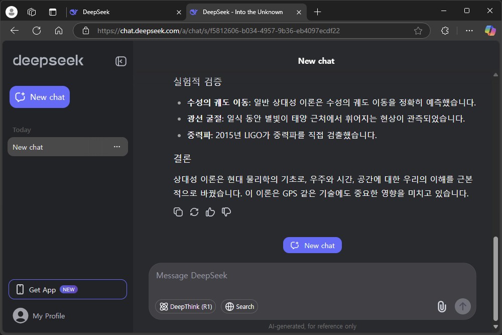 딥시크(DeepSeek)를 오픈AI의 챗GPT와 크게 다르지 않은 모습을 보여주고 있고 한글로 물어봐도 잘 알아듣는 편입니다. 그리고 설명 자체도 크게 어색하지 않았습니다. 그런데 속도는 조금 느린 것 같다는 느낌을 받았습니다.