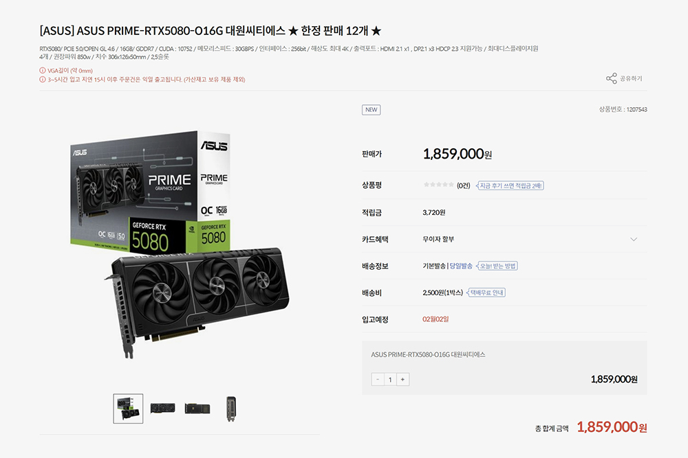 다양한 회사의 모델들이 판매되고 있지만 대표적인 컴퓨터 부품 구매 사이트인 컴퓨존에서는 ASUS PRIME-RTX5080-O16G 이라는 모델이 대원씨티에스 유통 제품은 12개, 인텍앤컴퍼니 제품은 5개가 1,859,000원이라는 금액으로 판매되었습니다. 최근 환율 상황과 맞물려서 가격이 만만하지는 않은 편입니다.