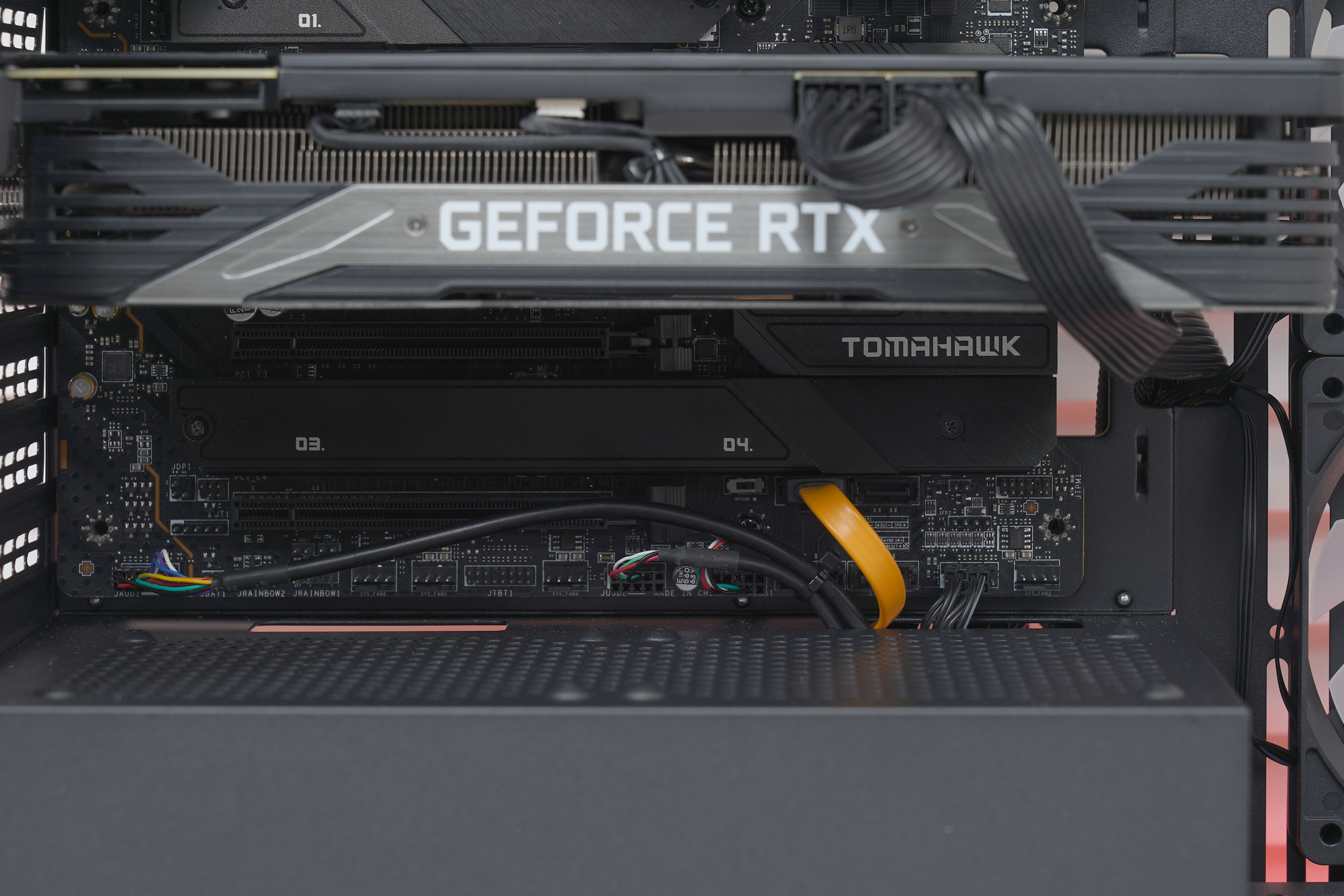 4개의 ARGB 팬의 커넥터를 메인보드의 5V ARGB 포트에 연결하면 전용 소프트웨어를 통해서 조명을 제어할 수 있게 됩니다. 제가 사용하는 메인보드는 MSI의 제품이라서 Mystic Light를 사용했고 ASUS는 AURA SYNC, 기가바이트는 RGB Fusion, 애즈락은 Polychrome Sync를 이용해주면 됩니다.