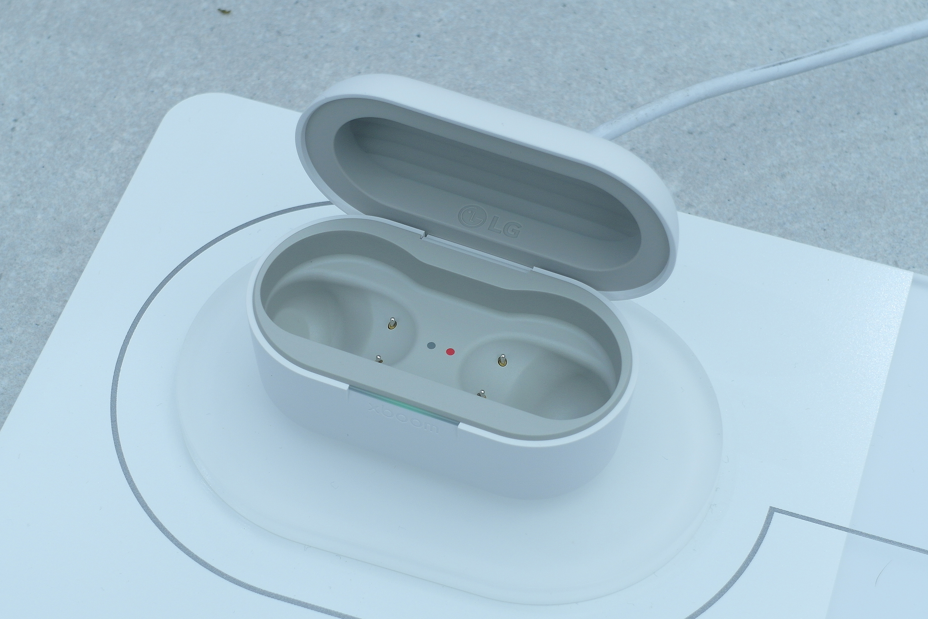 LG 엑스붐 버즈 무선 이어폰의 색상은 화이트와 블랙 두 가지로 출시되었습니다. 그리고 충전 케이스의 경우에는 크기가 크게 부담스럽지 않은 편이고 내부에 충전을 위한 두 개의 접점과 함께 충전 상태를 표시해주는 LED가 배치되어 있는 것을 확인할 수 있습니다.