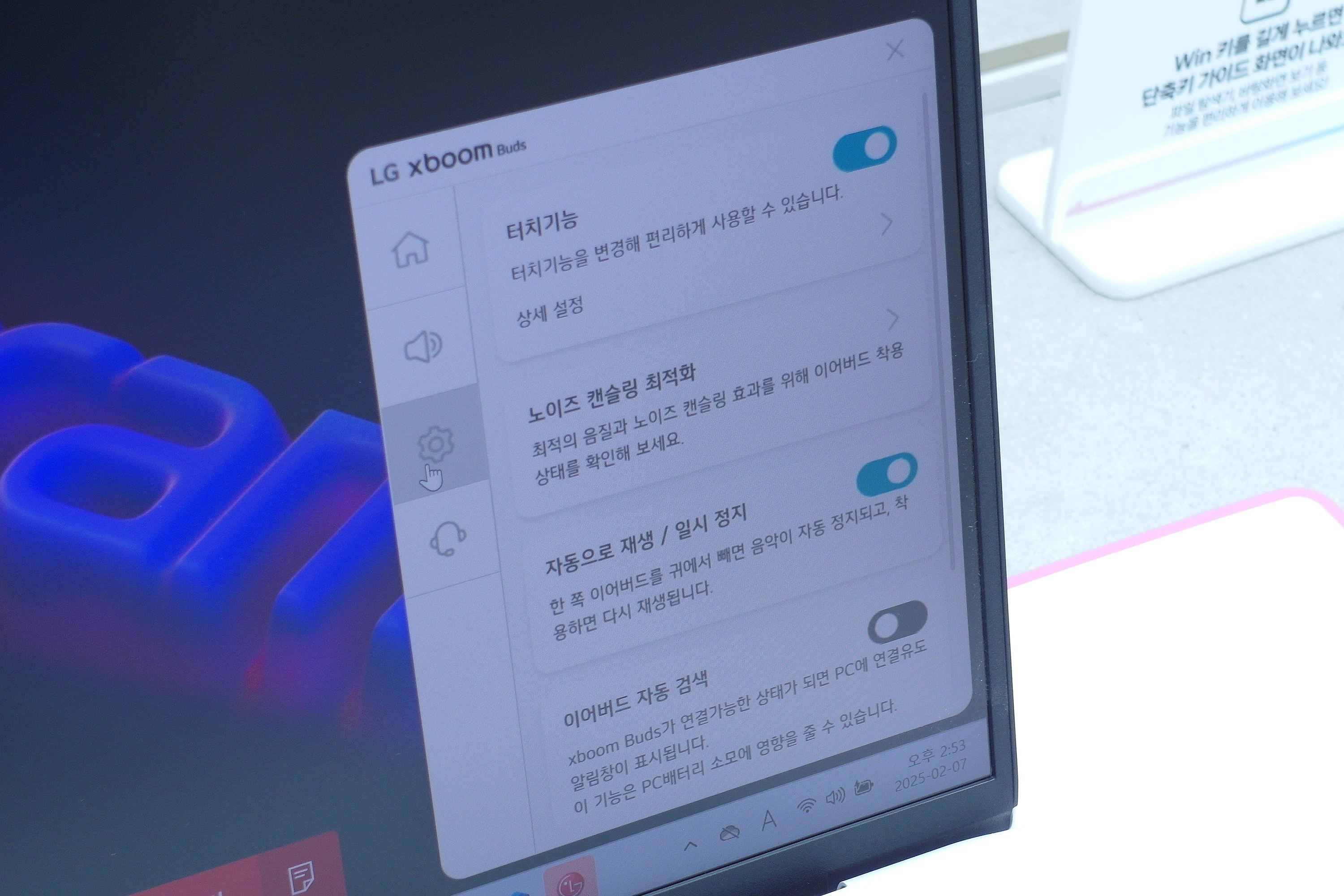 LG xboom Buds 설정에서는 터치 기능을 켜고 끌 수 있고 노이즈 캔슬링 최적화 기능도 준비되어 있습니다. 그리고 한 쪽 이어버드를 귀에서 빼면 음악이 자동 정지 되는 기능도 준비되어 있습니다. 최신 블루투스 이어폰들의 기본 기능이라고 할 수 있습니다.
