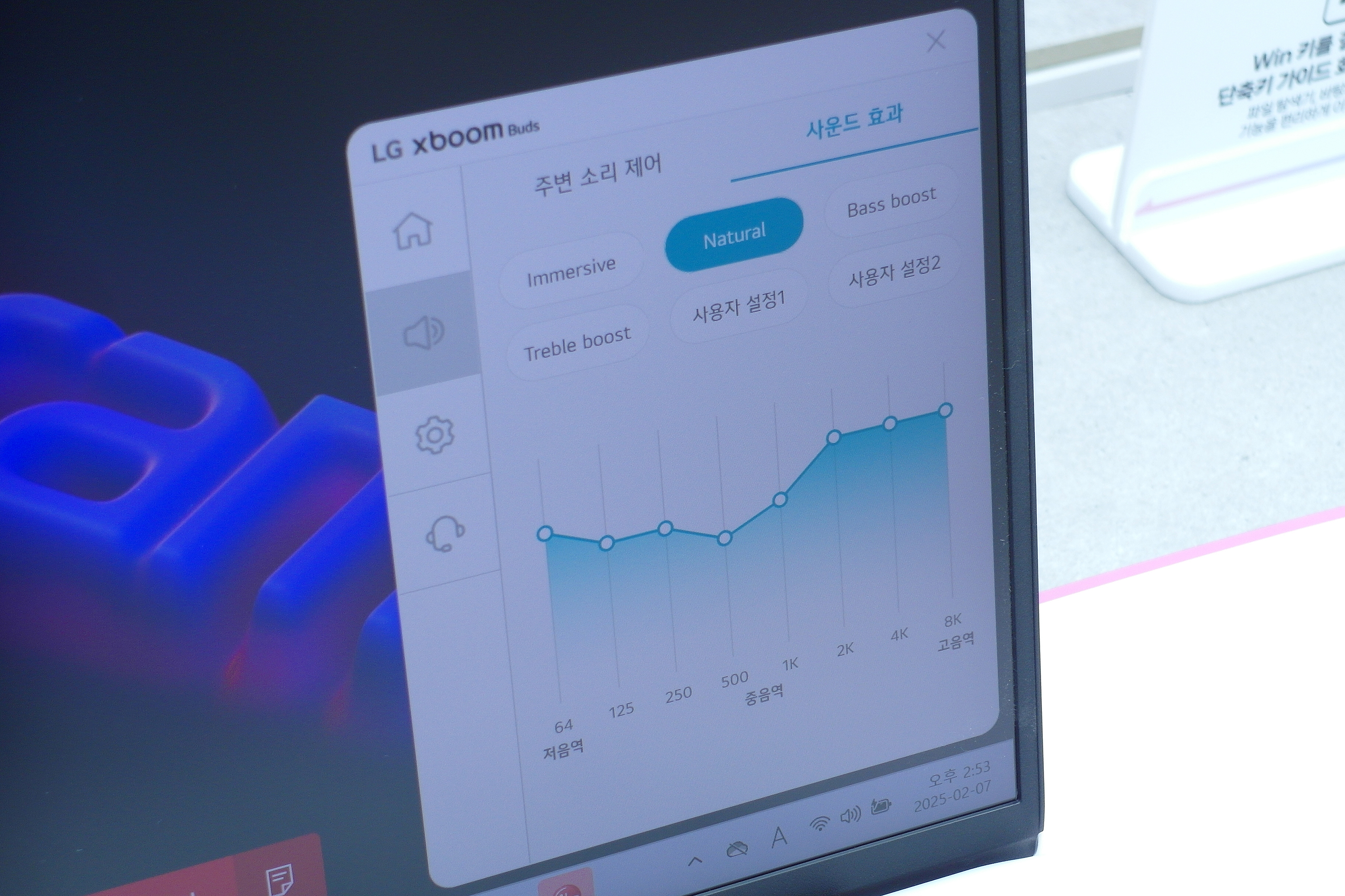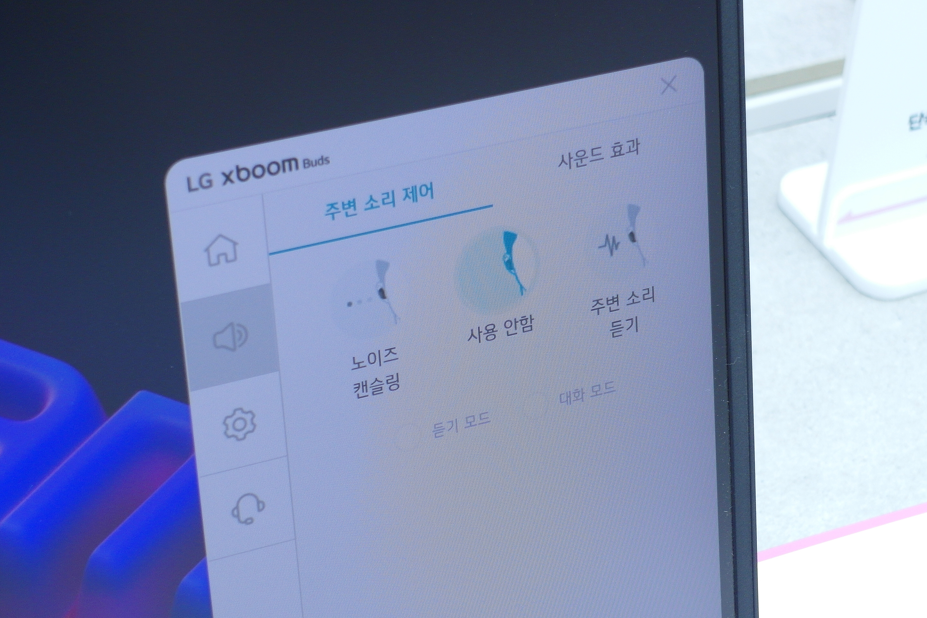 LG xboom Buds 소프트웨어를 살펴보면 배터리 상태를 확인할 수 있는 것은 물론이고 노이즈 캔슬링이나 주변 소리 듣기 기능을 설정할 수 있고 사운드 효과도 지정할 수 있습니다. 특히 사용자 설정 기능도 제공하기 때문에 자신의 취향에 맞게 음향을 세팅할 수 있습니다.