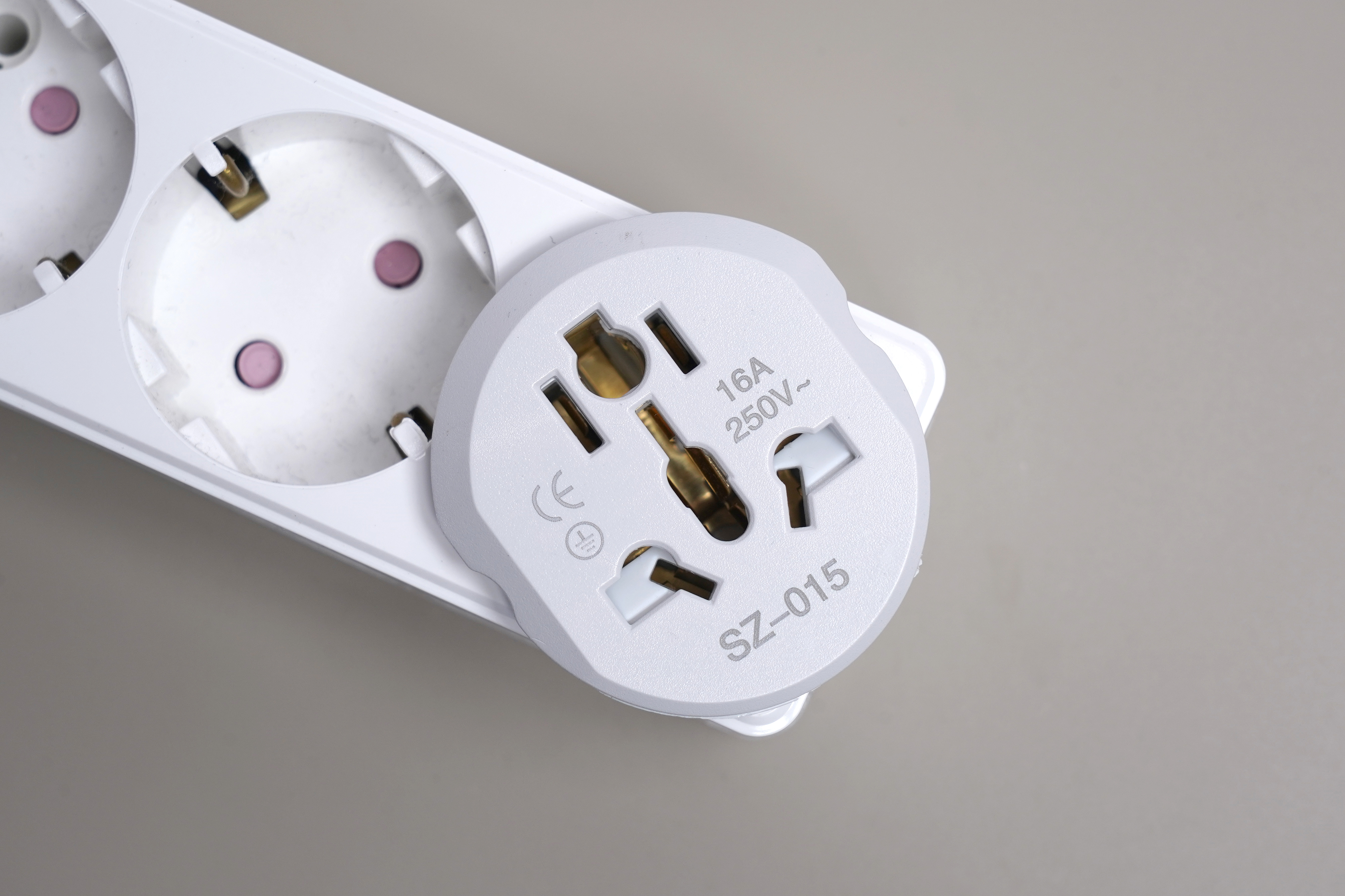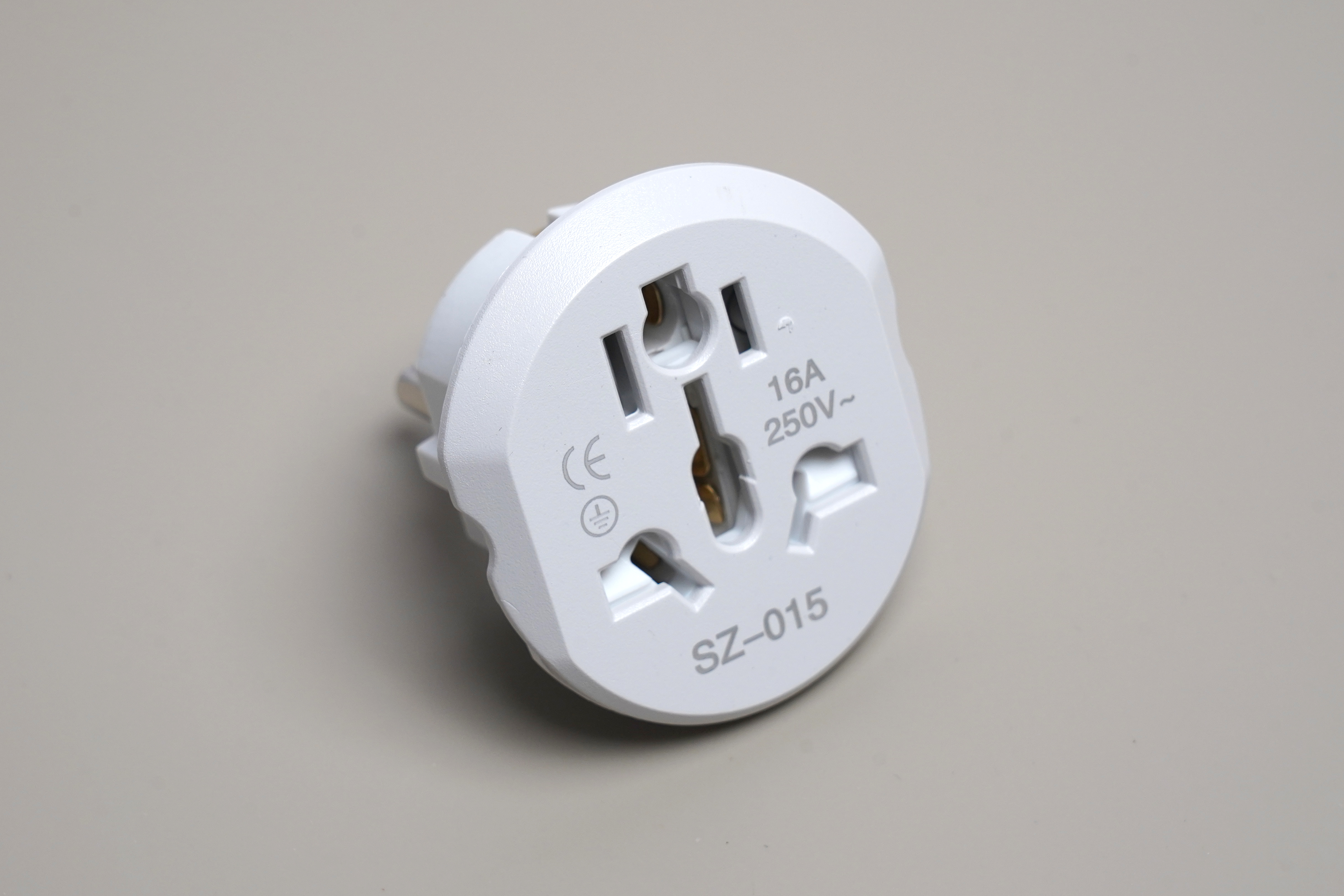 한국용 전기 어댑터는 호주나 미국, 영국, 중국의 전기 소켓을 EU나 한국으로 변환해 주는 형태로 제작되었습니다. 그래서 다양한 형태를 지원하기 위해서 구멍이 상당히 많은 편이라는 것을 확인할 수 있습니다. 그리고 아래쪽에 SZ-015라는 모델명이 표시되어 있습니다.