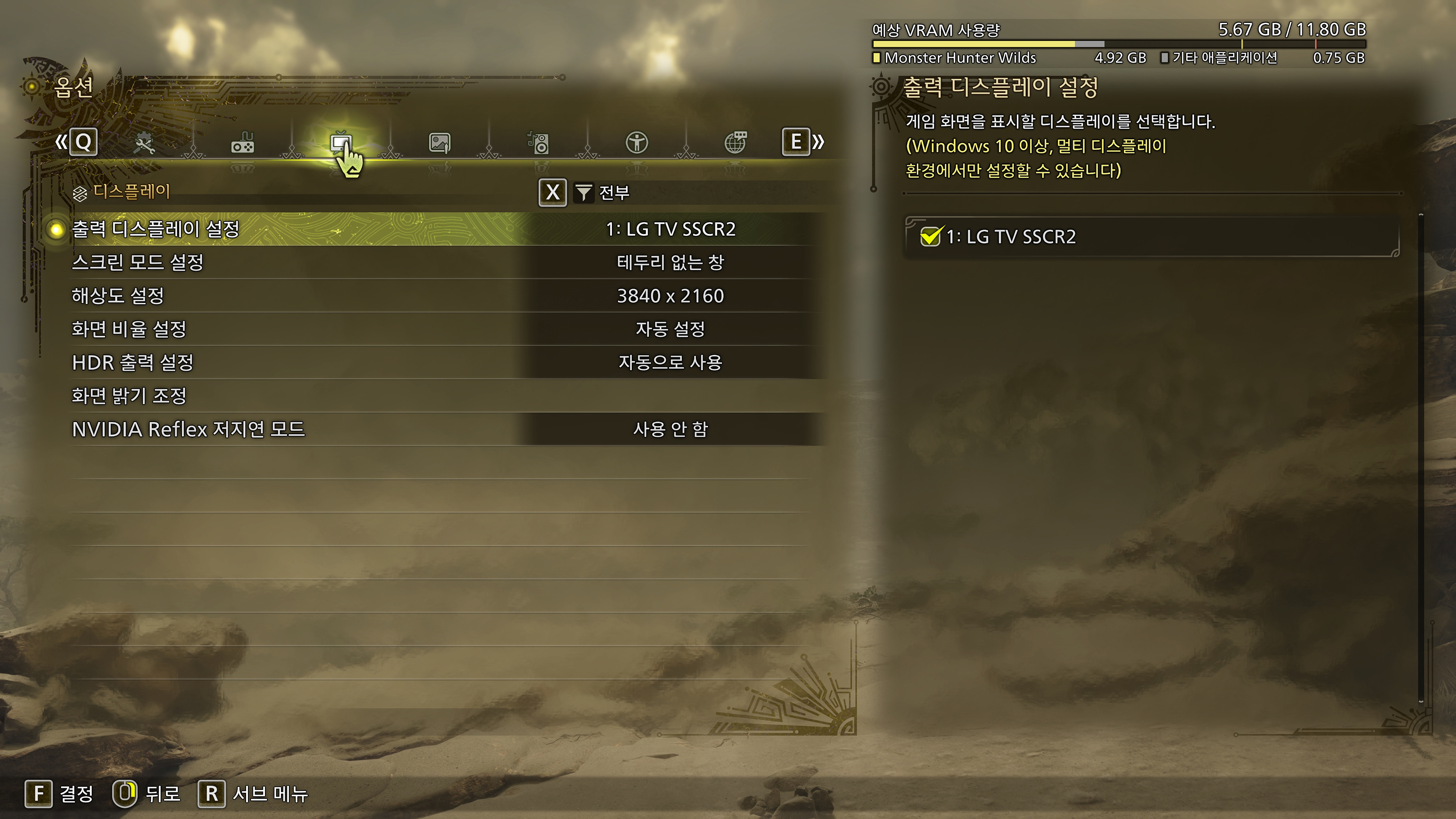 몬스터 헌터 와일즈 벤치마크 프로그램의 옵션을 살펴보면 디스플레이에서 해상도를 설정할 수 있고 NVIDIA Reflex 저지연 모드를 변경할 수 있습니다. 그리고 그래픽에서는 프리셋이나 업스케이일링(NVIDIA DLSS), 레이트레이싱, 텍스터 품질 등을 세팅할 수 있습니다.