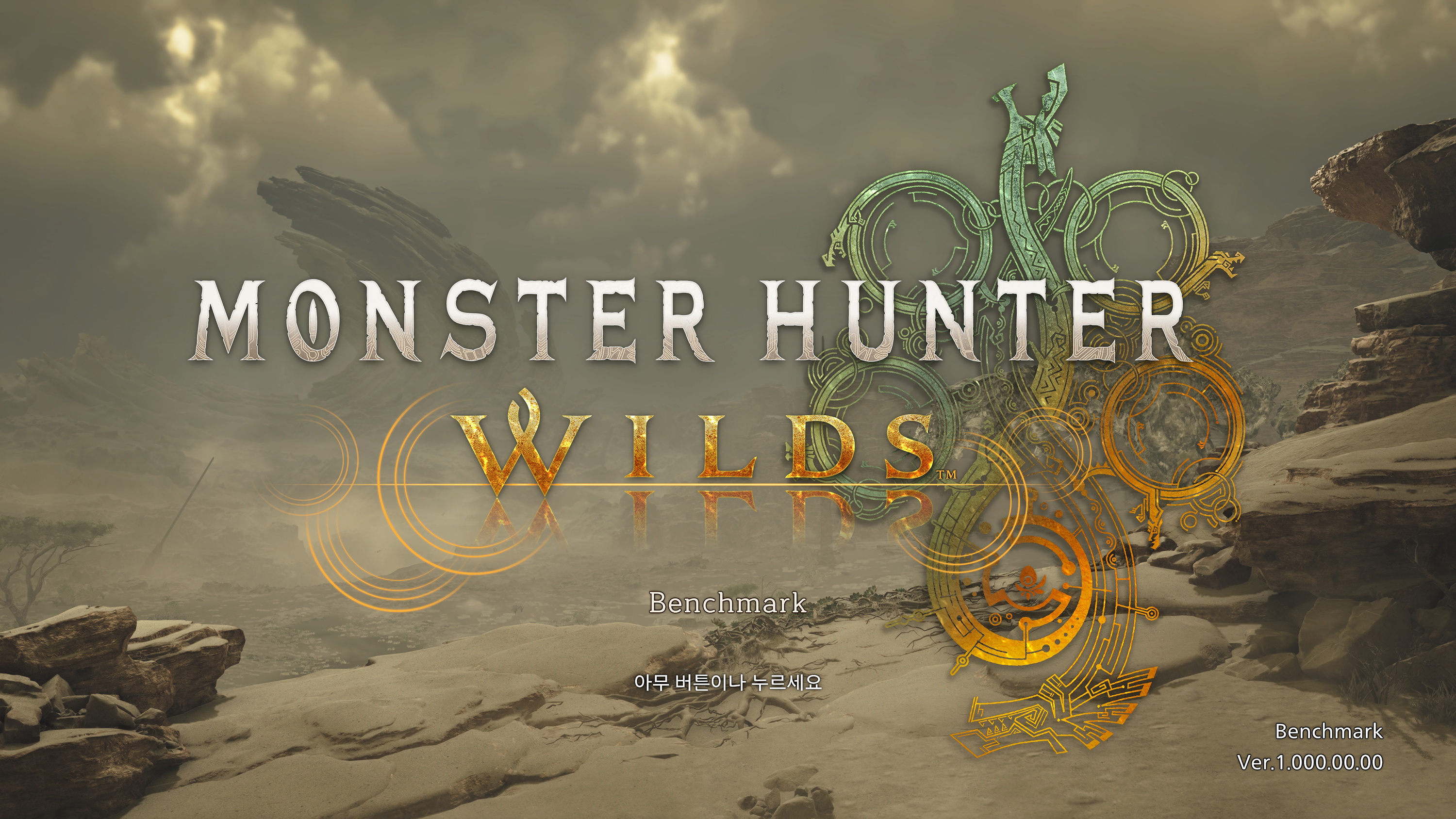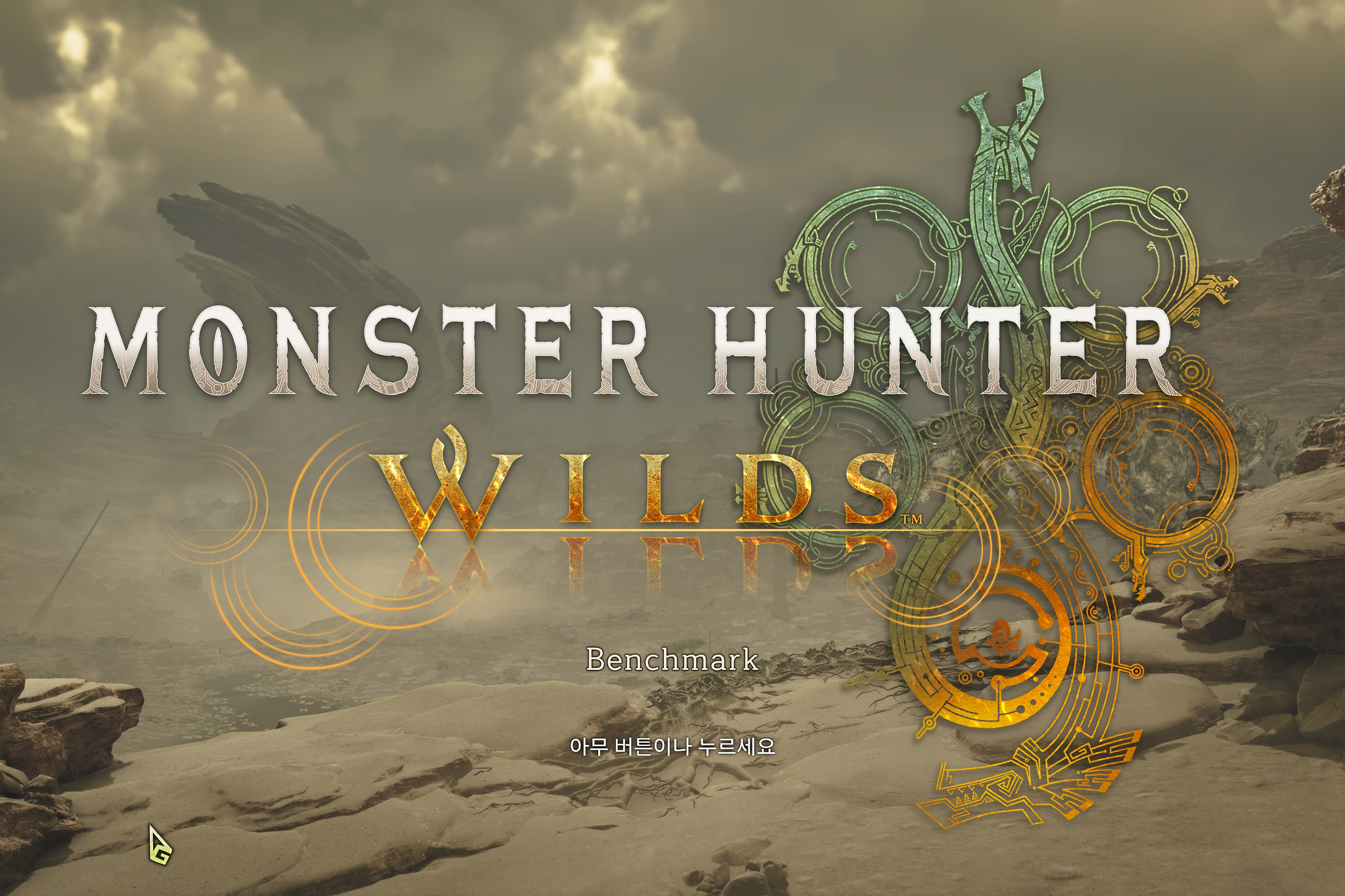 몬스터 헌터 와일즈 벤치마크 프로그램의 설치가 완료되면 위와 같이 아무 버튼이나 누르세요라는 문구가 표시되고 바로 Benchmark를 실행시키거나 옵션을 선택할 숭 lT는 메뉴가 준비되어 있습니다.
