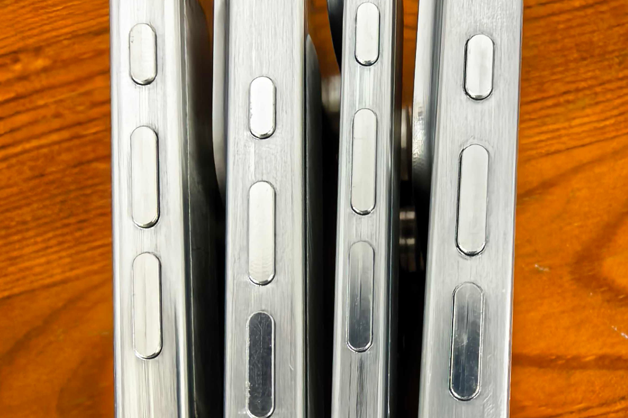 이번에 유출된 아이폰 17 시리즈의 금형을 살펴보면 왼쪽부터 아이폰 17 프로 맥스, 아이폰 17 프로, 아이폰 17 에어, 아이폰 17로 보이는데요. 프로와 에어 모델은 카메라섬의 크기가 상당히 커진 것을 확인할 수 있습니다. 그리고 뒷면의 소재 역시도 메탈과 강화 유리 두 가지가 부위별로 다르게 사용될 가능성이 있다고 합니다.