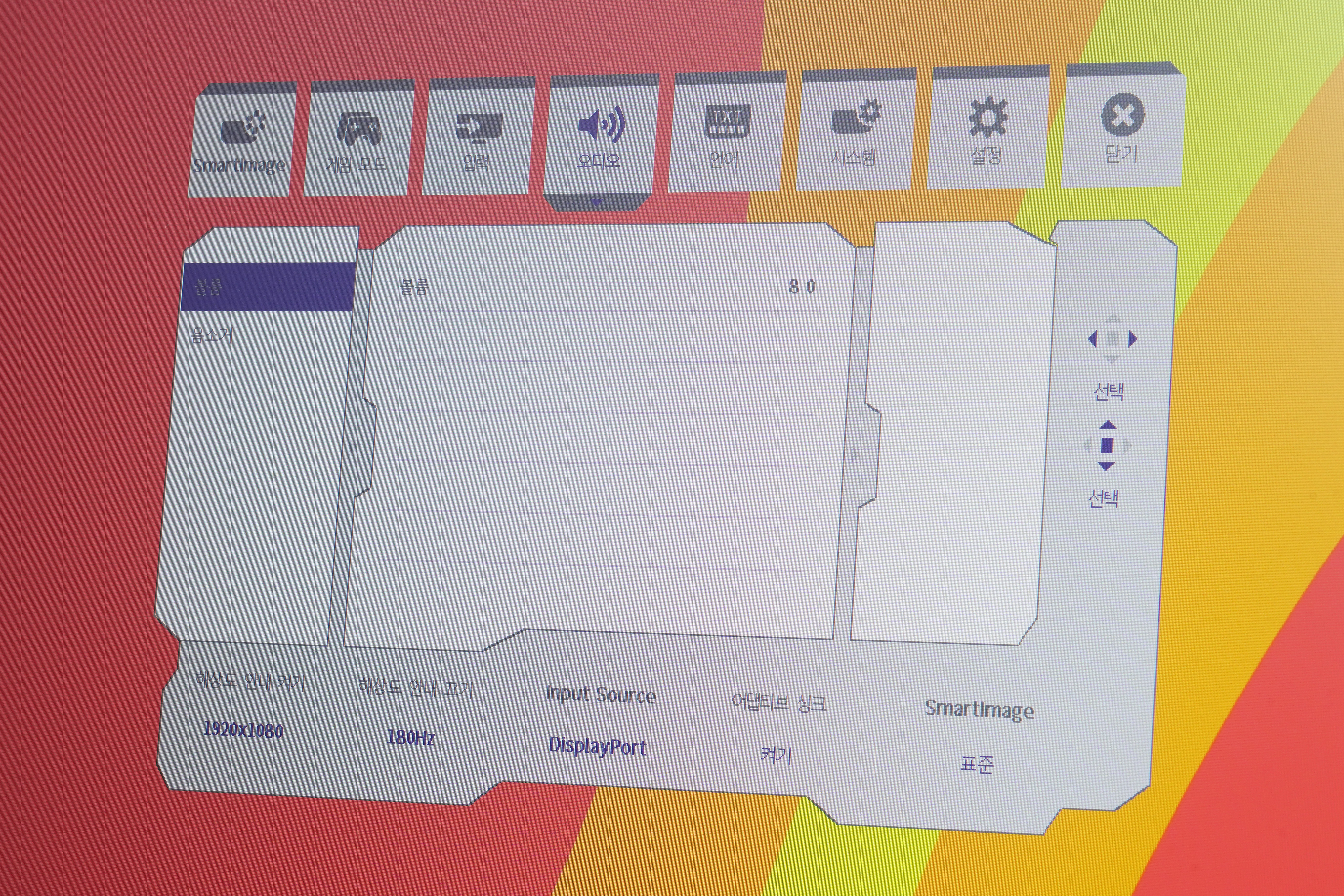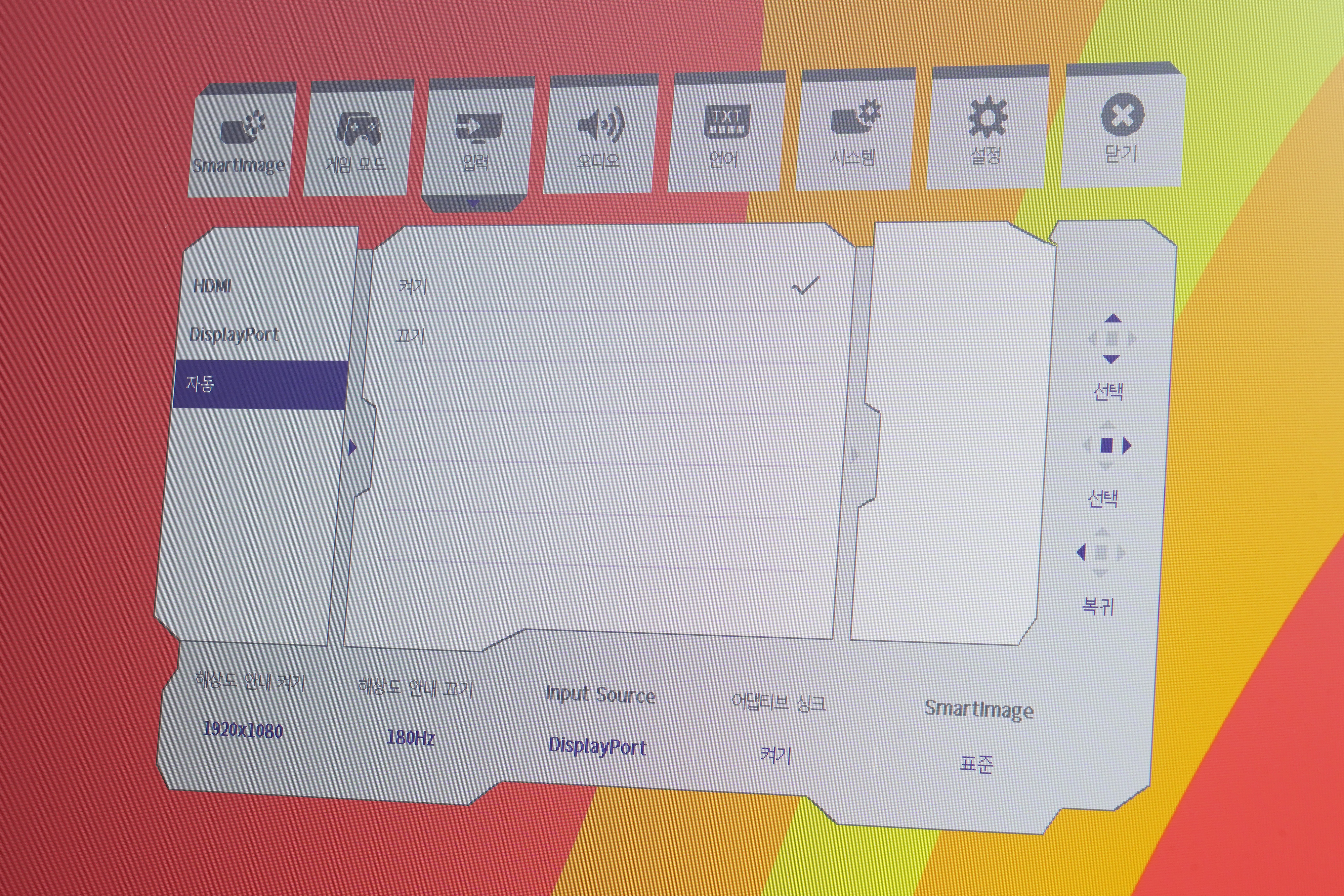 입력에서는 HDMI나 DisplayPort를 선택할 수 있고 자동으로 전환할 수 있는 기능도 갖추고 있습니다, 컴퓨터와 콘솔 게임기를 동시에 연결해서 사용하는 분들에게 유용한 옵션입니다. 그리고 오디오에서 볼륨을 조절하거나 음소거를 할 수 있습니다.